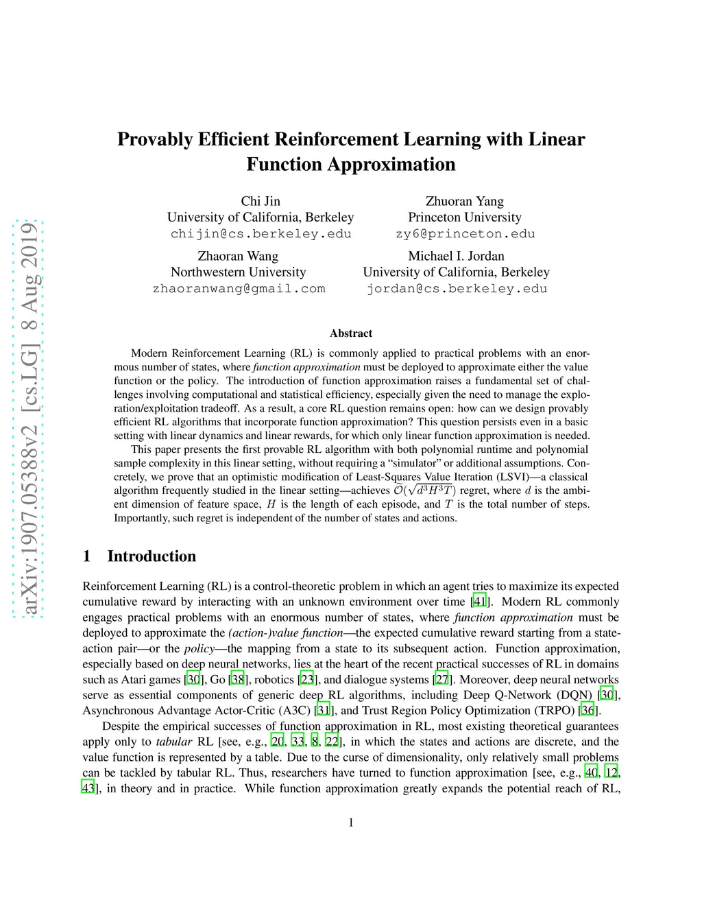Modern Reinforcement Learning (RL) is commonly applied to practical problems with an enormous number of states, where function approximation must be deployed to approximate either the value function or the policy. The introduction of function approximation raises a fundamental set of challenges involving computational and statistical efficiency, especially given the need to manage the exploration/exploitation tradeoff. As a result, a core RL question remains open: how can we design provably efficient RL algorithms that incorporate function approximation? This question persists even in a basic setting with linear dynamics and linear rewards, for which only linear function approximation is needed. This paper presents the first provable RL algorithm with both polynomial runtime and polynomial sample complexity in this linear setting, without requiring a "simulator" or additional assumptions. Concretely, we prove that an optimistic modification of Least-Squares Value Iteration (LSVI)---a classical algorithm frequently studied in the linear setting---achieves regret, where is the ambient dimension of feature space, is the length of each episode, and is the total number of steps. Importantly, such regret is independent of the number of states and actions.