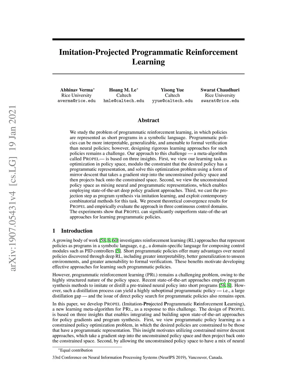 We study the problem of programmatic reinforcement learning, in which policies are represented as short programs in a symbolic language. Programmatic policies can be more interpretable, generalizable, and amenable to formal verification than neural policies; however, designing rigorous learning approaches for such policies remains a challenge. Our approach to this challenge -- a meta-algorithm called PROPEL -- is based on three insights. First, we view our learning task as optimization in policy space, modulo the constraint that the desired policy has a programmatic representation, and solve this optimization problem using a form of mirror descent that takes a gradient step into the unconstrained policy space and then projects back onto the constrained space. Second, we view the unconstrained policy space as mixing neural and programmatic representations, which enables employing state-of-the-art deep policy gradient approaches. Third, we cast the projection step as program synthesis via imitation learning, and exploit contemporary combinatorial methods for this task. We present theoretical convergence results for PROPEL and empirically evaluate the approach in three continuous control domains. The experiments show that PROPEL can significantly outperform state-of-the-art approaches for learning programmatic policies.