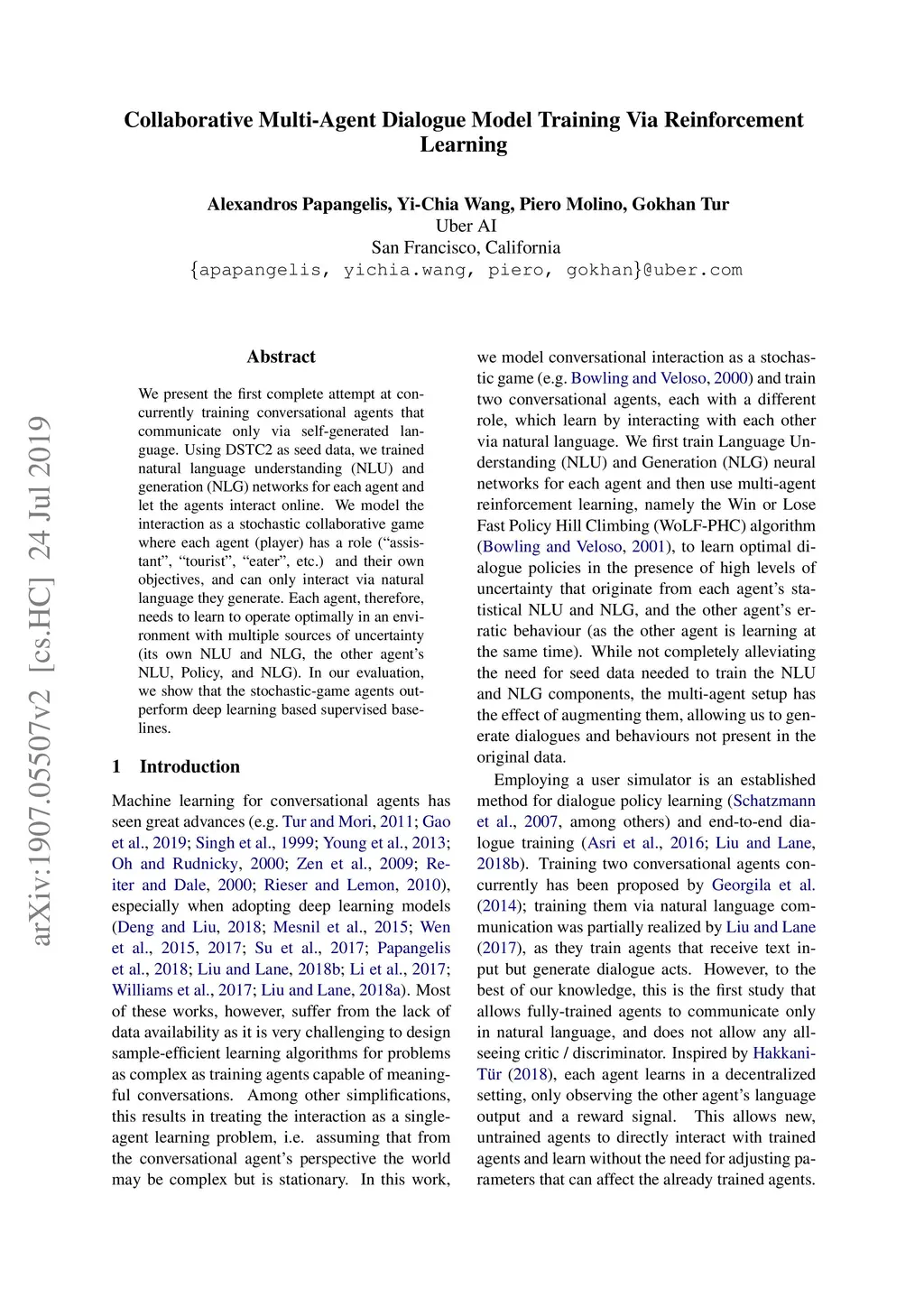Collaborative Multi-Agent Dialogue Model Training Via Reinforcement