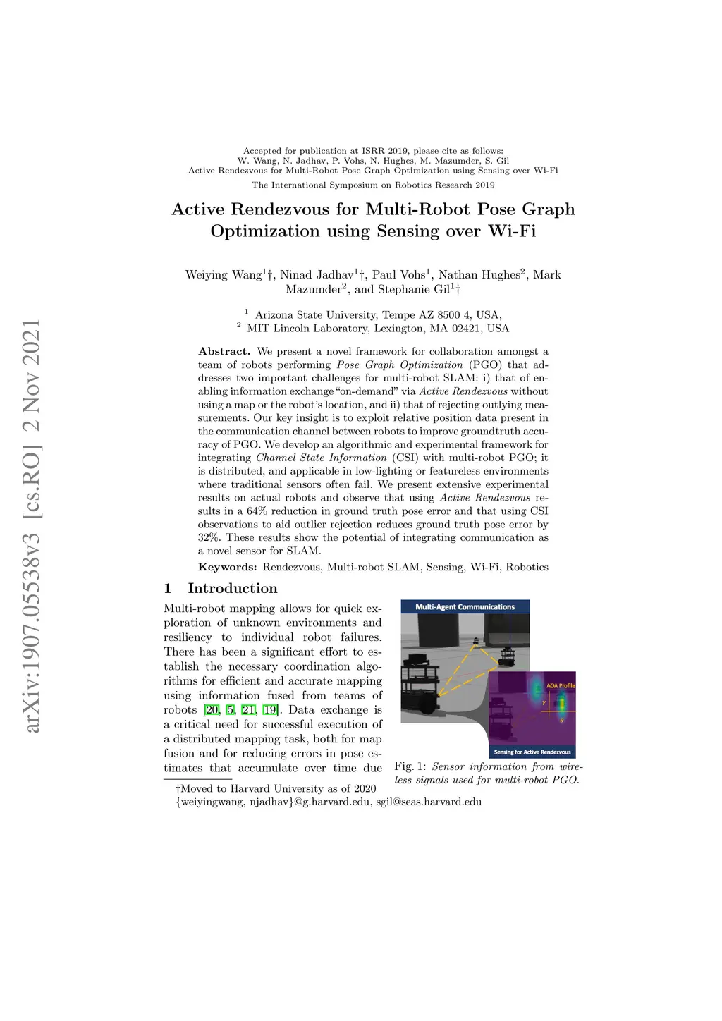 We present a novel framework for collaboration amongst a team of robots performing Pose Graph Optimization (PGO) that addresses two important challenges for multi-robot SLAM: i) that of enabling information exchange "on-demand" via Active Rendezvous without using a map or the robot's location, and ii) that of rejecting outlying measurements. Our key insight is to exploit relative position data present in the communication channel between robots to improve groundtruth accuracy of PGO. We develop an algorithmic and experimental framework for integrating Channel State Information (CSI) with multi-robot PGO; it is distributed, and applicable in low-lighting or featureless environments where traditional sensors often fail. We present extensive experimental results on actual robots and observe that using Active Rendezvous results in a 64% reduction in ground truth pose error and that using CSI observations to aid outlier rejection reduces ground truth pose error by 32%. These results show the potential of integrating communication as a novel sensor for SLAM.