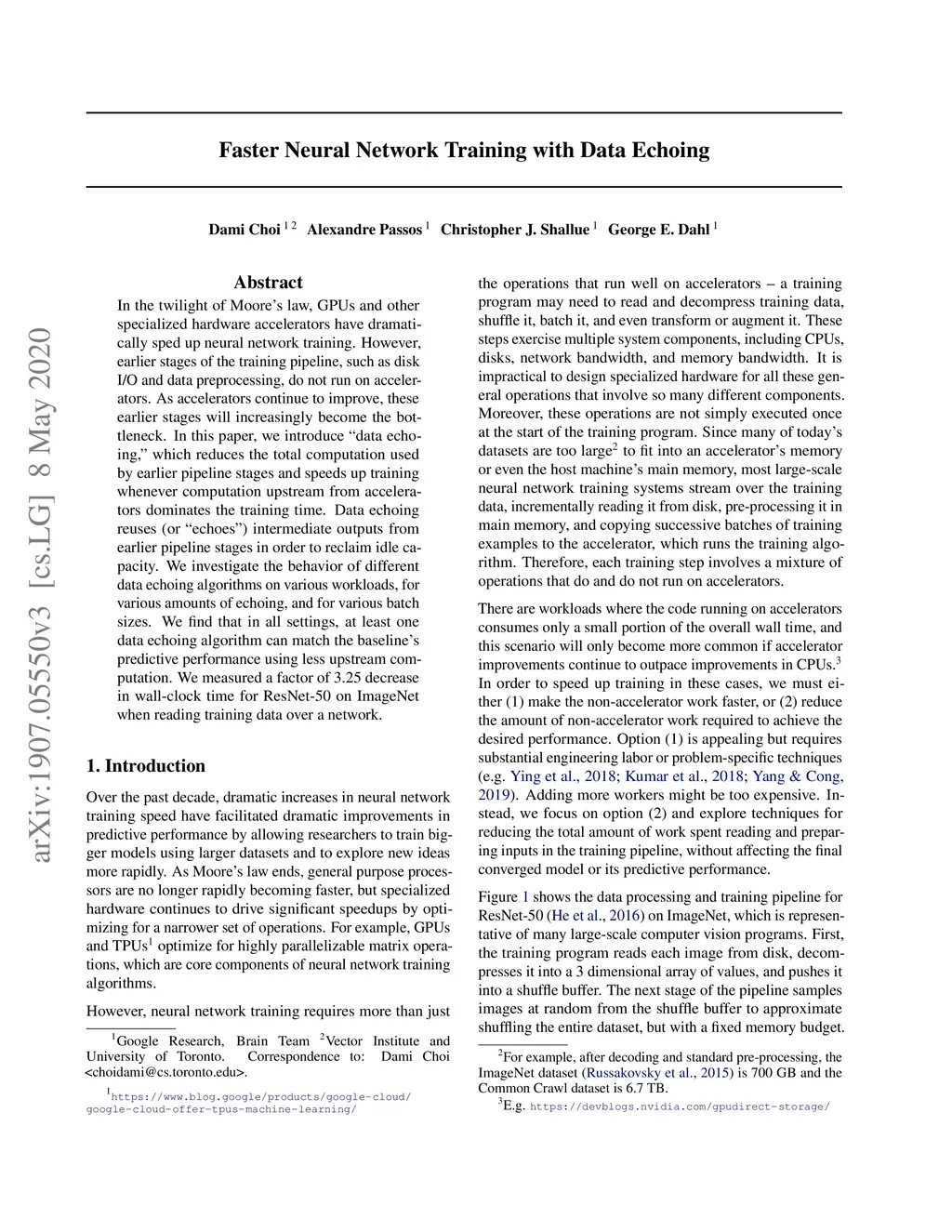 In the twilight of Moore's law, GPUs and other specialized hardware accelerators have dramatically sped up neural network training. However, earlier stages of the training pipeline, such as disk I/O and data preprocessing, do not run on accelerators. As accelerators continue to improve, these earlier stages will increasingly become the bottleneck. In this paper, we introduce "data echoing," which reduces the total computation used by earlier pipeline stages and speeds up training whenever computation upstream from accelerators dominates the training time. Data echoing reuses (or "echoes") intermediate outputs from earlier pipeline stages in order to reclaim idle capacity. We investigate the behavior of different data echoing algorithms on various workloads, for various amounts of echoing, and for various batch sizes. We find that in all settings, at least one data echoing algorithm can match the baseline's predictive performance using less upstream computation. We measured a factor of 3.25 decrease in wall-clock time for ResNet-50 on ImageNet when reading training data over a network.