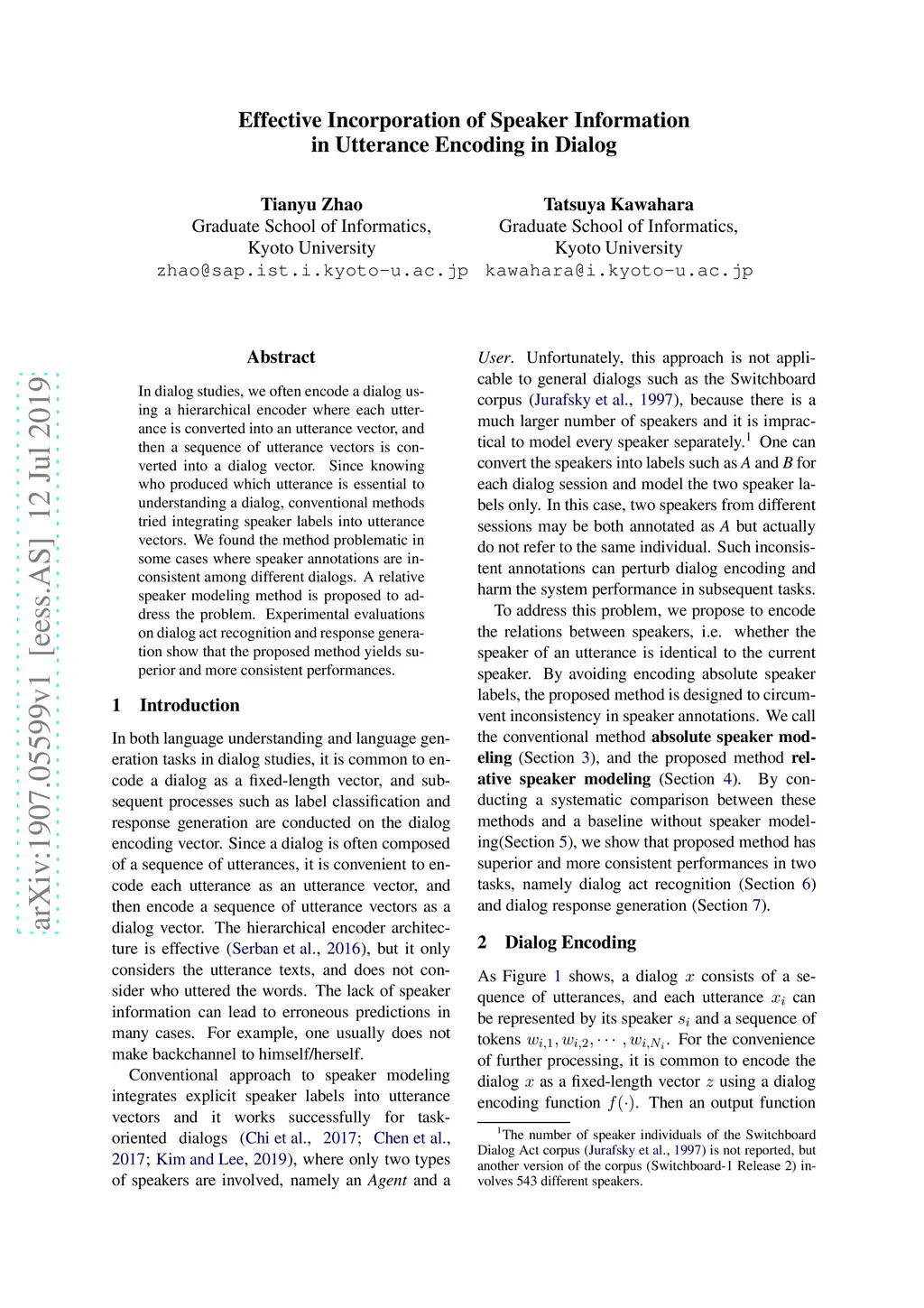 In dialog studies, we often encode a dialog using a hierarchical encoder where each utterance is converted into an utterance vector, and then a sequence of utterance vectors is converted into a dialog vector. Since knowing who produced which utterance is essential to understanding a dialog, conventional methods tried integrating speaker labels into utterance vectors. We found the method problematic in some cases where speaker annotations are inconsistent among different dialogs. A relative speaker modeling method is proposed to address the problem. Experimental evaluations on dialog act recognition and response generation show that the proposed method yields superior and more consistent performances.
