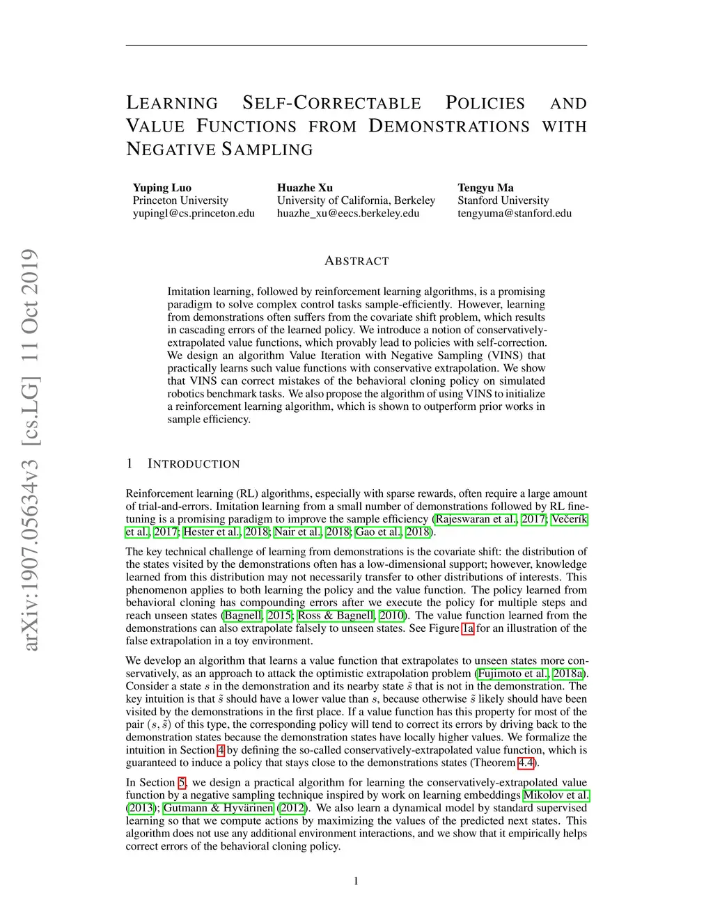 Imitation learning, followed by reinforcement learning algorithms, is a promising paradigm to solve complex control tasks sample-efficiently. However, learning from demonstrations often suffers from the covariate shift problem, which results in cascading errors of the learned policy. We introduce a notion of conservatively-extrapolated value functions, which provably lead to policies with self-correction. We design an algorithm Value Iteration with Negative Sampling (VINS) that practically learns such value functions with conservative extrapolation. We show that VINS can correct mistakes of the behavioral cloning policy on simulated robotics benchmark tasks. We also propose the algorithm of using VINS to initialize a reinforcement learning algorithm, which is shown to outperform significantly prior works in sample efficiency.