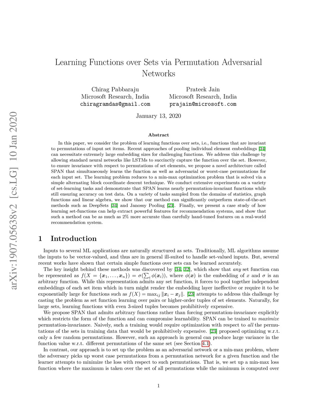 In this paper, we consider the problem of learning functions over sets, i.e., functions that are invariant to permutations of input set items. Recent approaches of pooling individual element embeddings can necessitate extremely large embedding sizes for challenging functions. We address this challenge by allowing standard neural networks like LSTMs to succinctly capture the function over the set. However, to ensure invariance with respect to permutations of set elements, we propose a novel architecture called SPAN that simultaneously learns the function as well as adversarial or worst-case permutations for each input set. The learning problem reduces to a min-max optimization problem that is solved via a simple alternating block coordinate descent technique. We conduct extensive experiments on a variety of set-learning tasks and demonstrate that SPAN learns nearly permutation-invariant functions while still ensuring accuracy on test data. On a variety of tasks sampled from the domains of statistics, graph functions and linear algebra, we show that our method can significantly outperform state-of-the-art methods such as DeepSets and Janossy Pooling. Finally, we present a case study of how learning set-functions can help extract powerful features for recommendation systems, and show that such a method can be as much as 2% more accurate than carefully hand-tuned features on a real-world recommendation system.