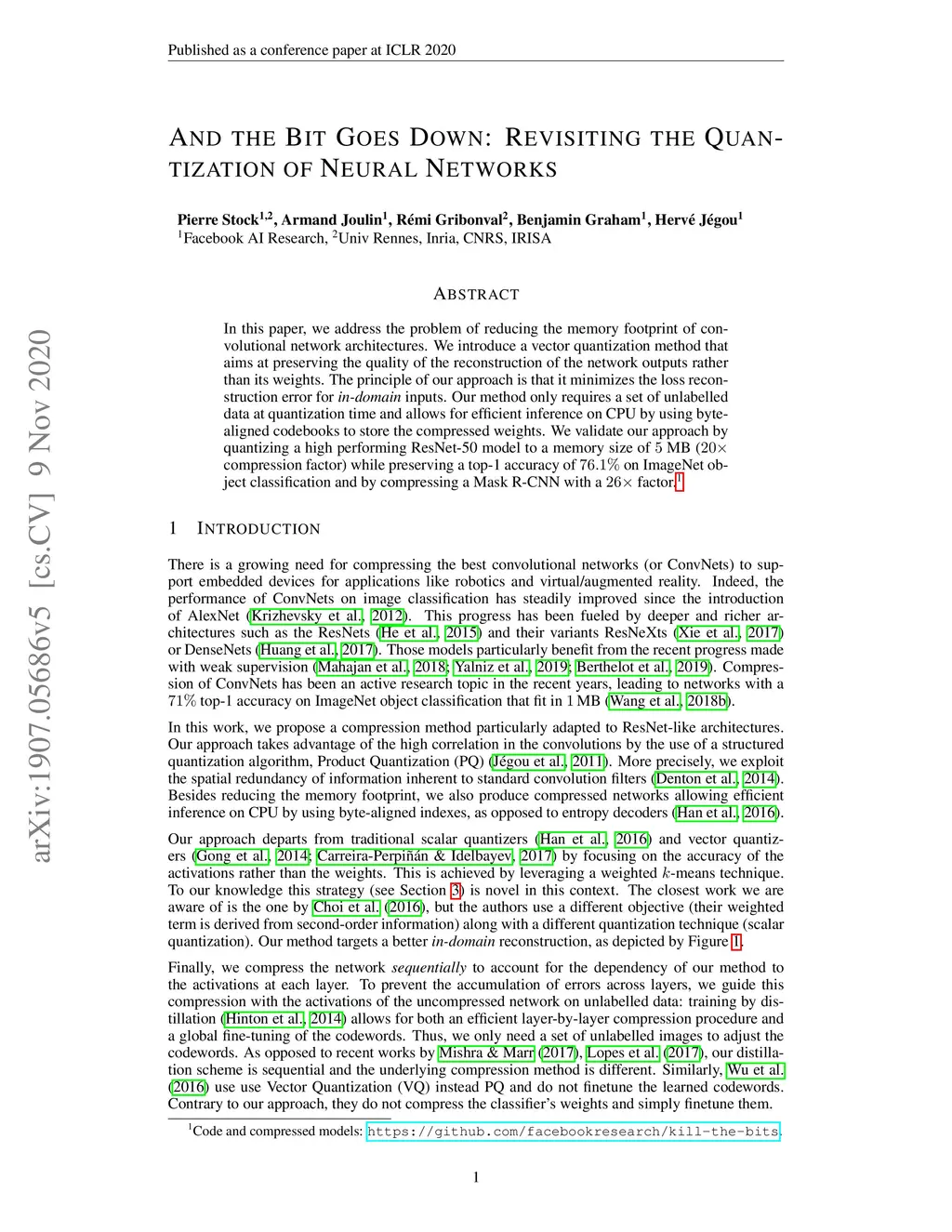In this paper, we address the problem of reducing the memory footprint of convolutional network architectures. We introduce a vector quantization method that aims at preserving the quality of the reconstruction of the network outputs rather than its weights. The principle of our approach is that it minimizes the loss reconstruction error for in-domain inputs. Our method only requires a set of unlabelled data at quantization time and allows for efficient inference on CPU by using byte-aligned codebooks to store the compressed weights. We validate our approach by quantizing a high performing ResNet-50 model to a memory size of 5MB (20x compression factor) while preserving a top-1 accuracy of 76.1% on ImageNet object classification and by compressing a Mask R-CNN with a 26x factor.