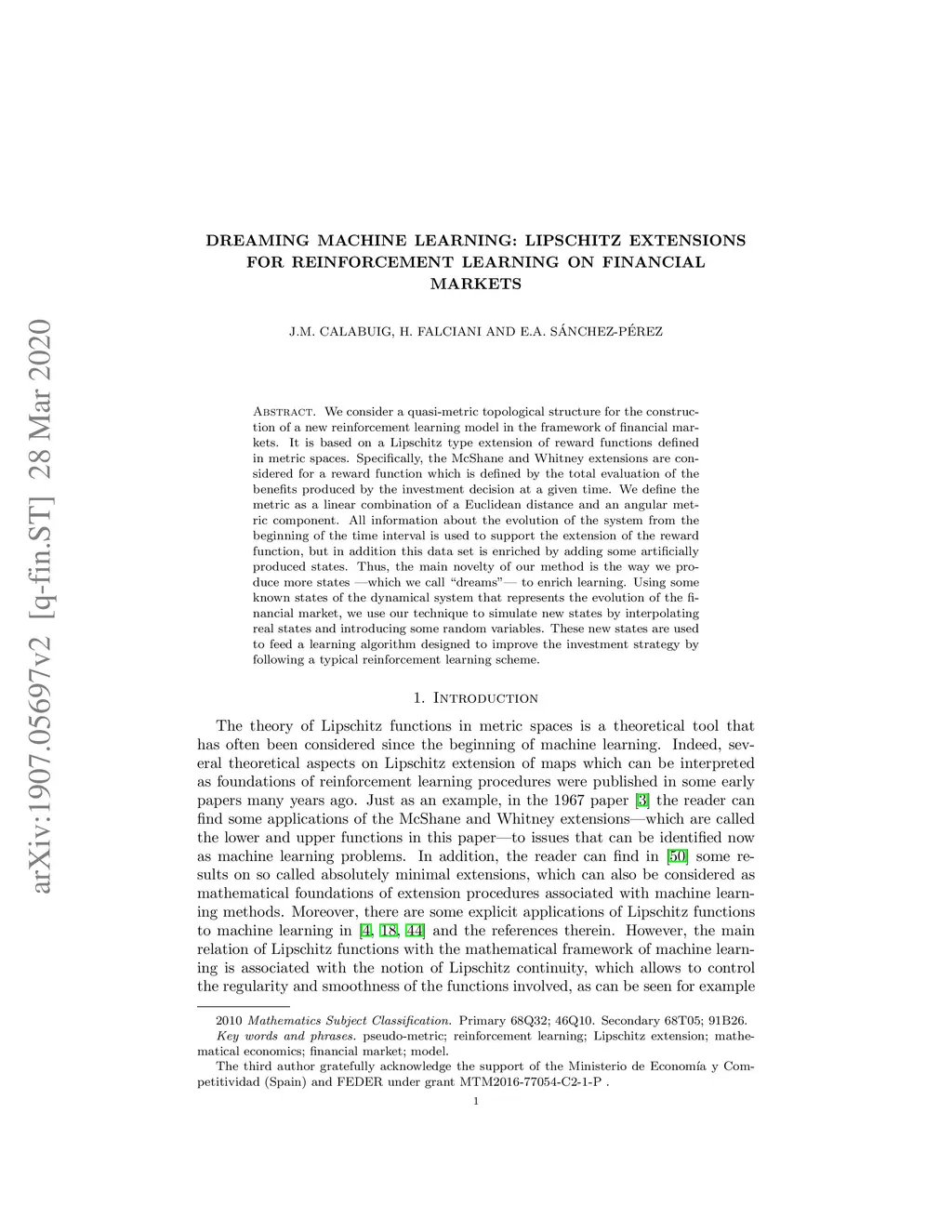 We consider a quasi-metric topological structure for the construction of a new reinforcement learning model in the framework of financial markets. It is based on a Lipschitz type extension of reward functions defined in metric spaces. Specifically, the McShane and Whitney extensions are considered for a reward function which is defined by the total evaluation of the benefits produced by the investment decision at a given time. We define the metric as a linear combination of a Euclidean distance and an angular metric component. All information about the evolution of the system from the beginning of the time interval is used to support the extension of the reward function, but in addition this data set is enriched by adding some artificially produced states. Thus, the main novelty of our method is the way we produce more states -- which we call "dreams" -- to enrich learning. Using some known states of the dynamical system that represents the evolution of the financial market, we use our technique to simulate new states by interpolating real states and introducing some random variables. These new states are used to feed a learning algorithm designed to improve the investment strategy by following a typical reinforcement learning scheme.
