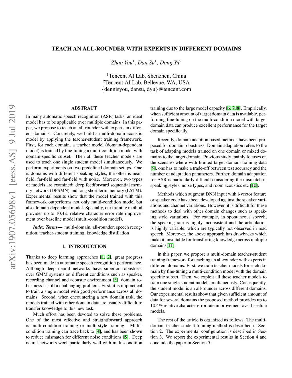 In many automatic speech recognition (ASR) tasks, an ideal model has to be applicable over multiple domains. In this paper, we propose to teach an all-rounder with experts in different domains. Concretely, we build a multi-domain acoustic model by applying the teacher-student training framework. First, for each domain, a teacher model (domain-dependent model) is trained by fine-tuning a multi-condition model with domain-specific subset. Then all these teacher models are used to teach one single student model simultaneously. We perform experiments on two predefined domain setups. One is domains with different speaking styles, the other is nearfield, far-field and far-field with noise. Moreover, two types of models are examined: deep feedforward sequential memory network (DFSMN) and long short term memory (LSTM). Experimental results show that the model trained with this framework outperforms not only multi-condition model but also domain-dependent model. Specially, our training method provides up to 10.4% relative character error rate improvement over baseline model (multi-condition model).