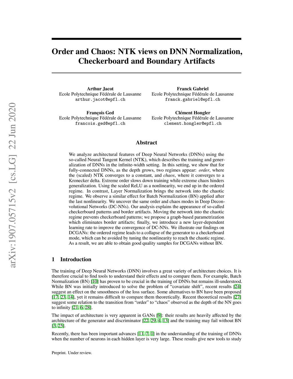We analyze architectural features of Deep Neural Networks (DNNs) using the so-called Neural Tangent Kernel (NTK), which describes the training and generalization of DNNs in the infinite-width setting. In this setting, we show that for fully-connected DNNs, as the depth grows, two regimes appear: "order", where the (scaled) NTK converges to a constant, and "chaos", where it converges to a Kronecker delta. Extreme order slows down training while extreme chaos hinders generalization. Using the scaled ReLU as a nonlinearity, we end up in the ordered regime. In contrast, Layer Normalization brings the network into the chaotic regime. We observe a similar effect for Batch Normalization (BN) applied after the last nonlinearity. We uncover the same order and chaos modes in Deep Deconvolutional Networks (DC-NNs). Our analysis explains the appearance of so-called checkerboard patterns and border artifacts. Moving the network into the chaotic regime prevents checkerboard patterns; we propose a graph-based parametrization which eliminates border artifacts; finally, we introduce a new layer-dependent learning rate to improve the convergence of DC-NNs. We illustrate our findings on DCGANs: the ordered regime leads to a collapse of the generator to a checkerboard mode, which can be avoided by tuning the nonlinearity to reach the chaotic regime. As a result, we are able to obtain good quality samples for DCGANs without BN.