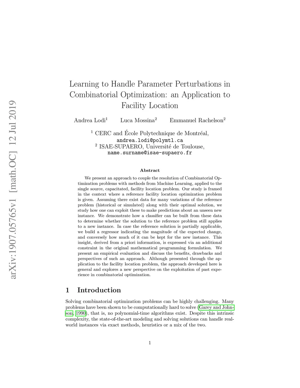 We present an approach to couple the resolution of Combinatorial Optimization problems with methods from Machine Learning, applied to the single source, capacitated, facility location problem. Our study is framed in the context where a reference facility location optimization problem is given. Assuming there exist data for many variations of the reference problem (historical or simulated) along with their optimal solution, we study how one can exploit these to make predictions about an unseen new instance. We demonstrate how a classifier can be built from these data to determine whether the solution to the reference problem still applies to a new instance. In case the reference solution is partially applicable, we build a regressor indicating the magnitude of the expected change, and conversely how much of it can be kept for the new instance. This insight, derived from a priori information, is expressed via an additional constraint in the original mathematical programming formulation. We present an empirical evaluation and discuss the benefits, drawbacks and perspectives of such an approach. Although presented through the application to the facility location problem, the approach developed here is general and explores a new perspective on the exploitation of past experience in combinatorial optimization.
