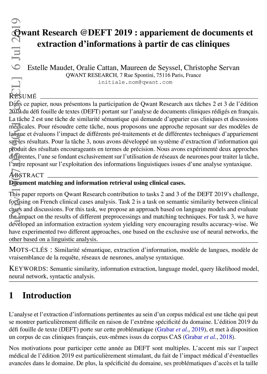 This paper reports on Qwant Research contribution to tasks 2 and 3 of the DEFT 2019's challenge, focusing on French clinical cases analysis. Task 2 is a task on semantic similarity between clinical cases and discussions. For this task, we propose an approach based on language models and evaluate the impact on the results of different preprocessings and matching techniques. For task 3, we have developed an information extraction system yielding very encouraging results accuracy-wise. We have experimented two different approaches, one based on the exclusive use of neural networks, the other based on a linguistic analysis.