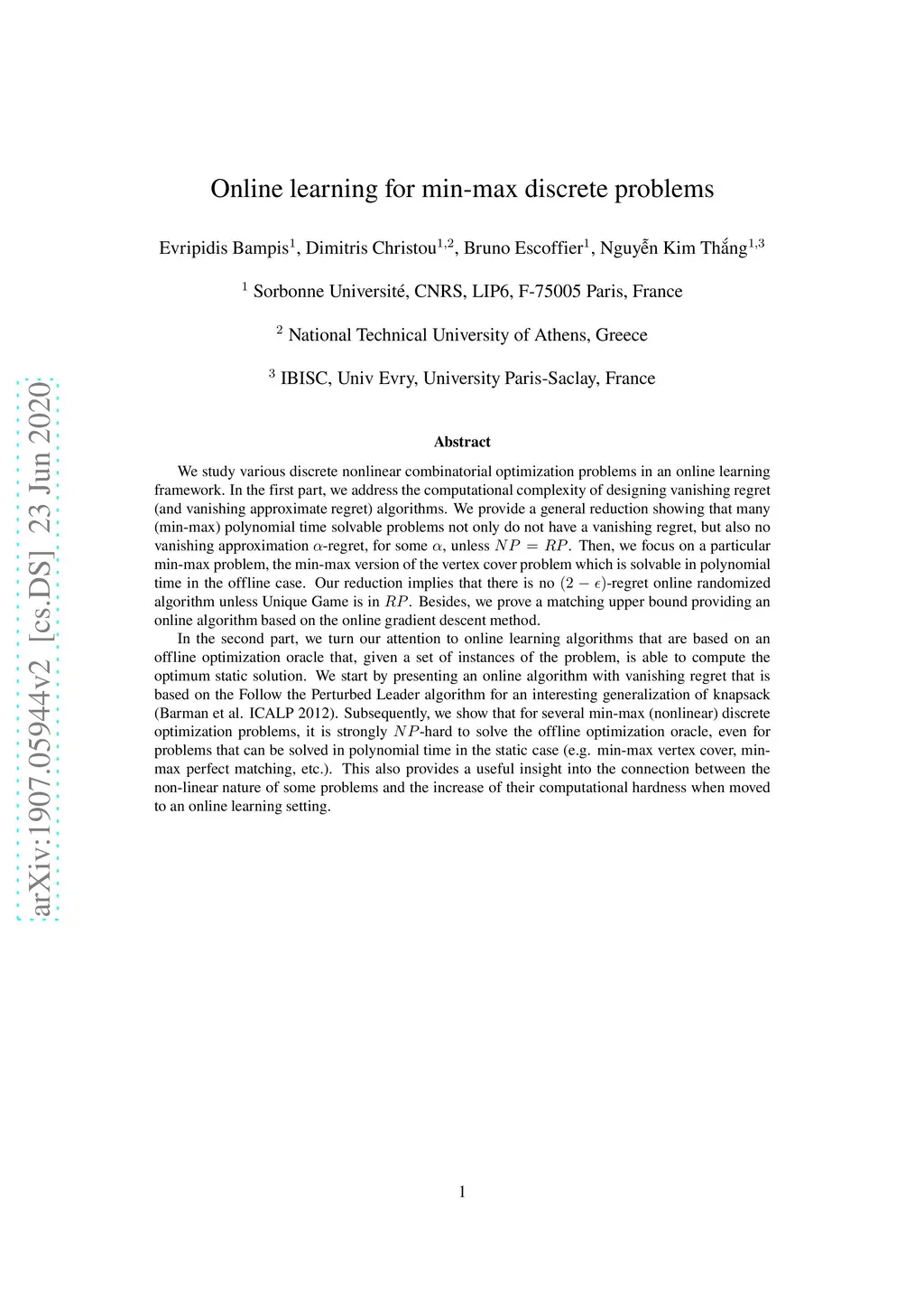 We study various discrete nonlinear combinatorial optimization problems in an online learning framework. In the first part, we address the question of whether there are negative results showing that getting a vanishing (or even vanishing approximate) regret is computational hard. We provide a general reduction showing that many (min-max) polynomial time solvable problems not only do not have a vanishing regret, but also no vanishing approximation -regret, for some (unless ). Then, we focus on a particular min-max problem, the min-max version of the vertex cover problem which is solvable in polynomial time in the offline case. The previous reduction proves that there is no -regret online algorithm, unless Unique Game is in ; we prove a matching upper bound providing an online algorithm based on the online gradient descent method. Then, we turn our attention to online learning algorithms that are based on an offline optimization oracle that, given a set of instances of the problem, is able to compute the optimum static solution. We show that for different nonlinear discrete optimization problems, it is strongly -hard to solve the offline optimization oracle, even for problems that can be solved in polynomial time in the static case (e.g. min-max vertex cover, min-max perfect matching, etc.). On the positive side, we present an online algorithm with vanishing regret that is based on the follow the perturbed leader algorithm for a generalized knapsack problem.