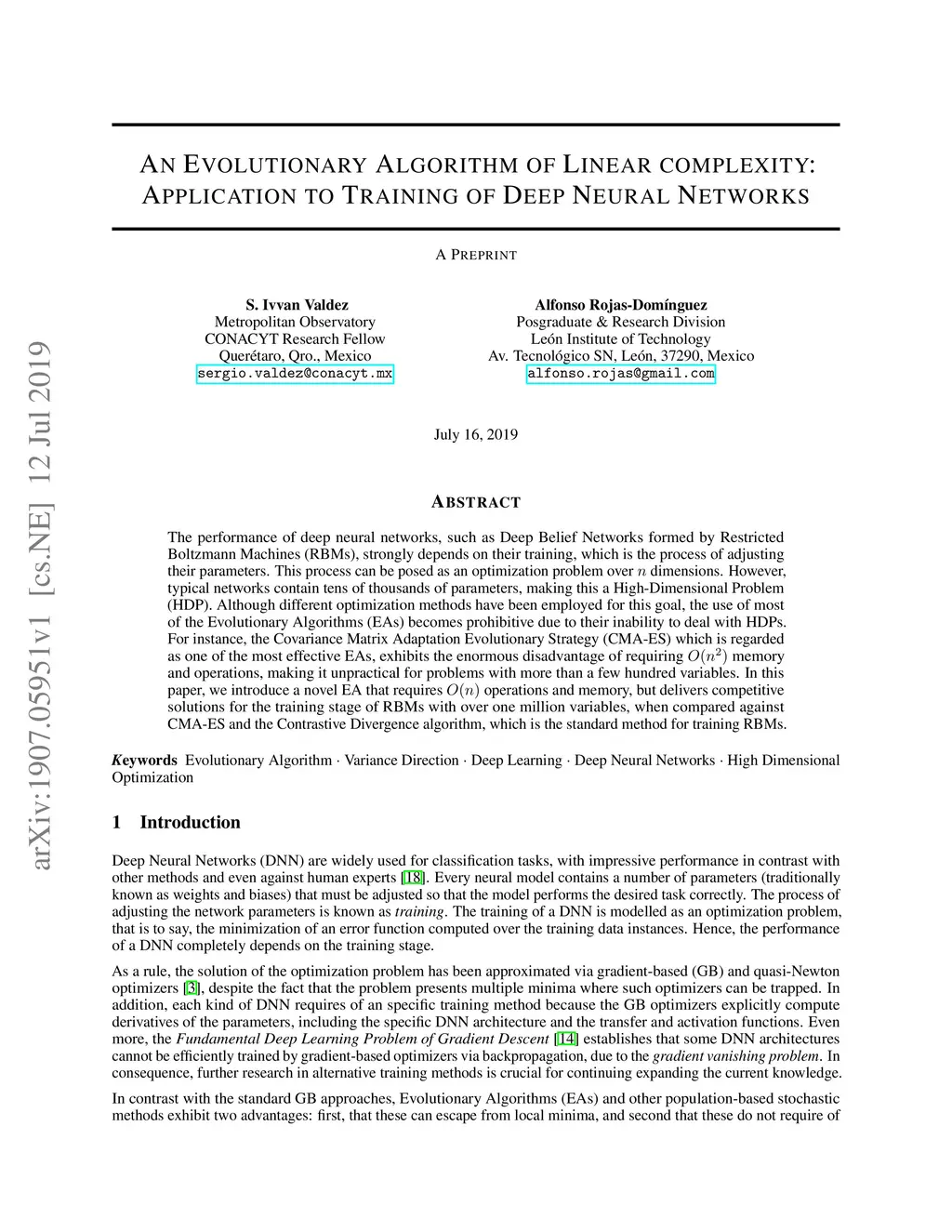 An Evolutionary Algorithm of Linear complexity: Application to Training