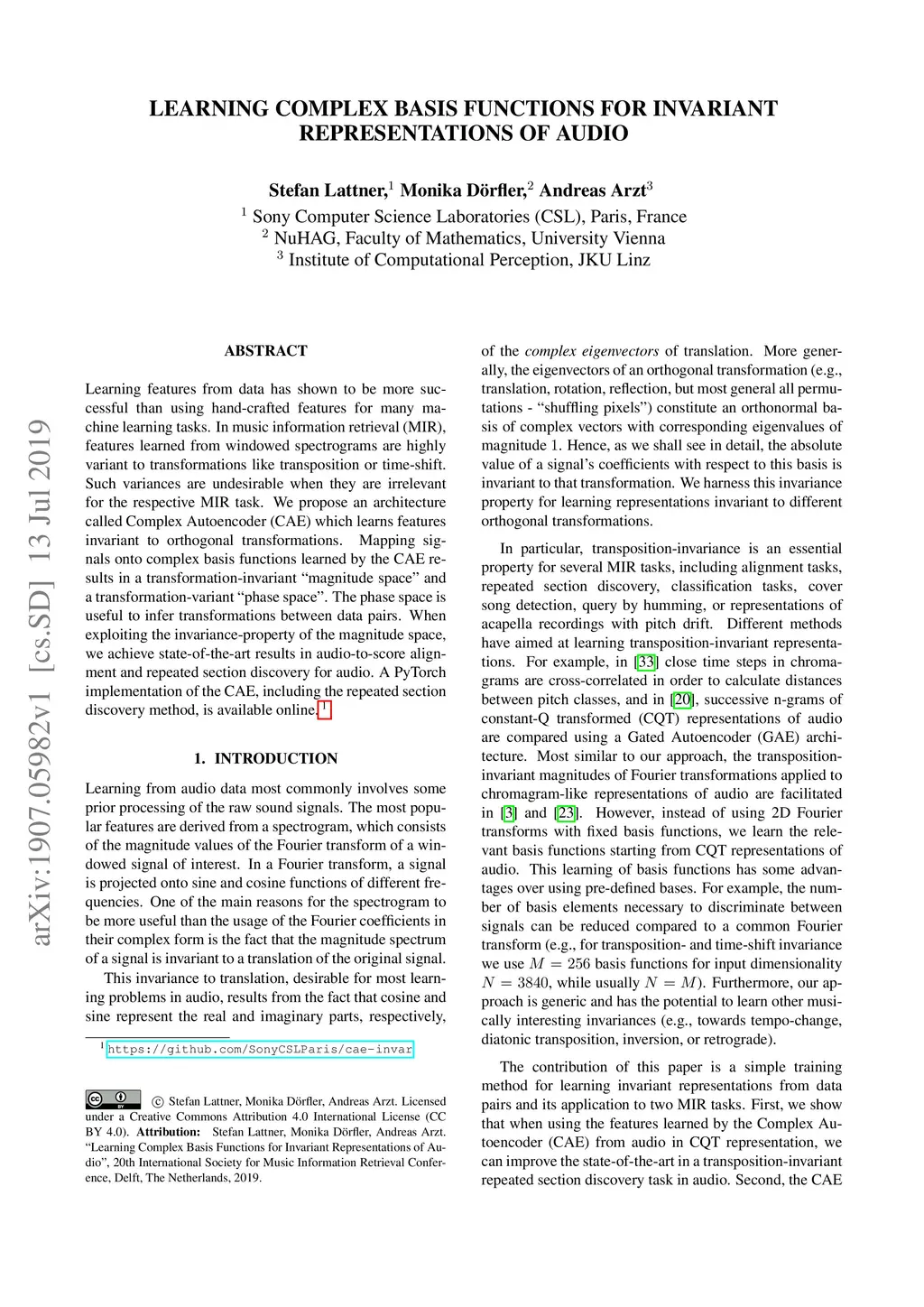 Learning features from data has shown to be more successful than using hand-crafted features for many machine learning tasks. In music information retrieval (MIR), features learned from windowed spectrograms are highly variant to transformations like transposition or time-shift. Such variances are undesirable when they are irrelevant for the respective MIR task. We propose an architecture called Complex Autoencoder (CAE) which learns features invariant to orthogonal transformations. Mapping signals onto complex basis functions learned by the CAE results in a transformation-invariant "magnitude space" and a transformation-variant "phase space". The phase space is useful to infer transformations between data pairs. When exploiting the invariance-property of the magnitude space, we achieve state-of-the-art results in audio-to-score alignment and repeated section discovery for audio. A PyTorch implementation of the CAE, including the repeated section discovery method, is available online.