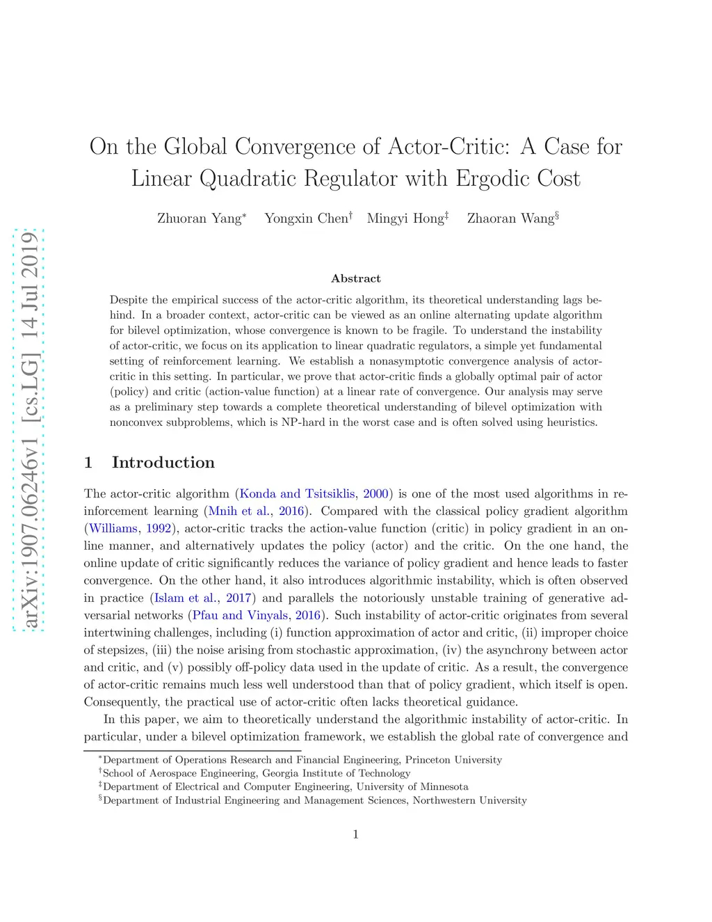 Despite the empirical success of the actor-critic algorithm, its theoretical understanding lags behind. In a broader context, actor-critic can be viewed as an online alternating update algorithm for bilevel optimization, whose convergence is known to be fragile. To understand the instability of actor-critic, we focus on its application to linear quadratic regulators, a simple yet fundamental setting of reinforcement learning. We establish a nonasymptotic convergence analysis of actor-critic in this setting. In particular, we prove that actor-critic finds a globally optimal pair of actor (policy) and critic (action-value function) at a linear rate of convergence. Our analysis may serve as a preliminary step towards a complete theoretical understanding of bilevel optimization with nonconvex subproblems, which is NP-hard in the worst case and is often solved using heuristics.