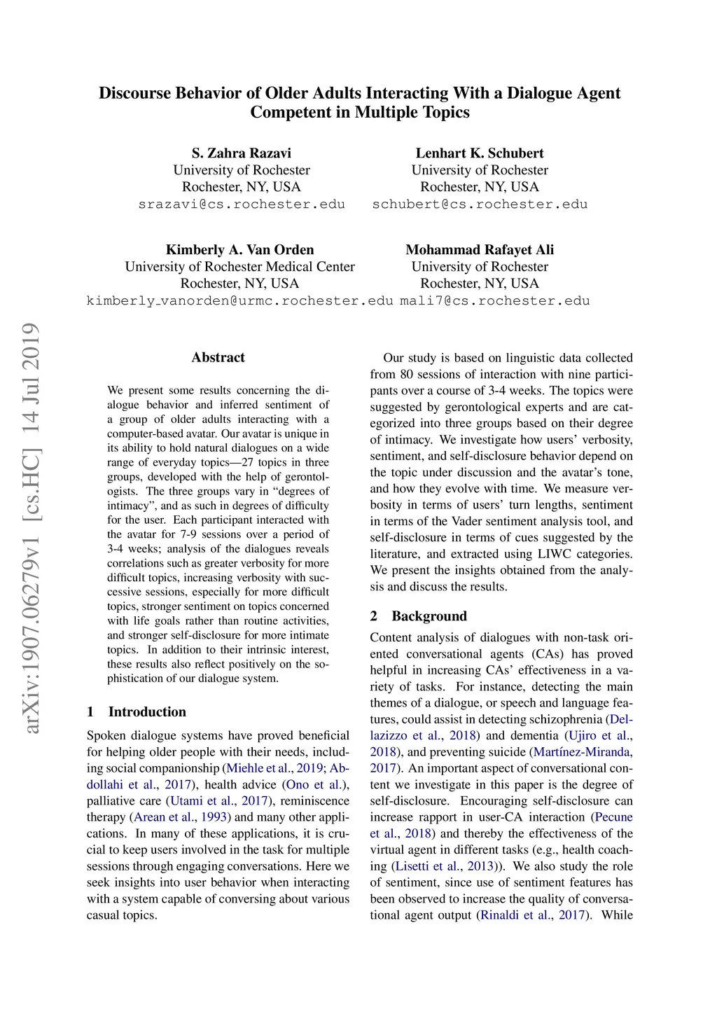 We present some results concerning the dialogue behavior and inferred sentiment of a group of older adults interacting with a computer-based avatar. Our avatar is unique in its ability to hold natural dialogues on a wide range of everyday topics---27 topics in three groups, developed with the help of gerontologists. The three groups vary in ``degrees of intimacy", and as such in degrees of difficulty for the user. Each participant interacted with the avatar for 7-9 sessions over a period of 3-4 weeks; analysis of the dialogues reveals correlations such as greater verbosity for more difficult topics, increasing verbosity with successive sessions, especially for more difficult topics, stronger sentiment on topics concerned with life goals rather than routine activities, and stronger self-disclosure for more intimate topics. In addition to their intrinsic interest, these results also reflect positively on the sophistication of our dialogue system.
