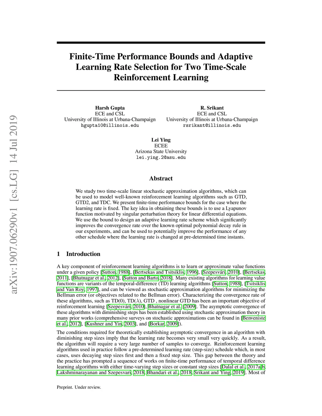 We study two time-scale linear stochastic approximation algorithms, which can be used to model well-known reinforcement learning algorithms such as GTD, GTD2, and TDC. We present finite-time performance bounds for the case where the learning rate is fixed. The key idea in obtaining these bounds is to use a Lyapunov function motivated by singular perturbation theory for linear differential equations. We use the bound to design an adaptive learning rate scheme which significantly improves the convergence rate over the known optimal polynomial decay rule in our experiments, and can be used to potentially improve the performance of any other schedule where the learning rate is changed at pre-determined time instants.