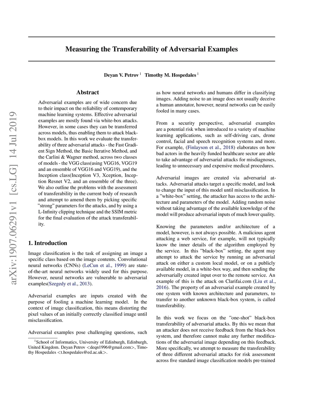 Adversarial examples are of wide concern due to their impact on the reliability of contemporary machine learning systems. Effective adversarial examples are mostly found via white-box attacks. However, in some cases they can be transferred across models, thus enabling them to attack black-box models. In this work we evaluate the transferability of three adversarial attacks - the Fast Gradient Sign Method, the Basic Iterative Method, and the Carlini & Wagner method, across two classes of models - the VGG class(using VGG16, VGG19 and an ensemble of VGG16 and VGG19), and the Inception class(Inception V3, Xception, Inception Resnet V2, and an ensemble of the three). We also outline the problems with the assessment of transferability in the current body of research and attempt to amend them by picking specific "strong" parameters for the attacks, and by using a L-Infinity clipping technique and the SSIM metric for the final evaluation of the attack transferability.