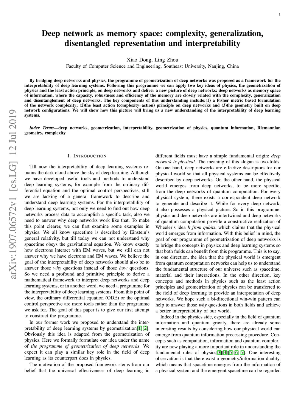 By bridging deep networks and physics, the programme of geometrization of deep networks was proposed as a framework for the interpretability of deep learning systems. Following this programme we can apply two key ideas of physics, the geometrization of physics and the least action principle, on deep networks and deliver a new picture of deep networks: deep networks as memory space of information, where the capacity, robustness and efficiency of the memory are closely related with the complexity, generalization and disentanglement of deep networks. The key components of this understanding include:(1) a Fisher metric based formulation of the network complexity; (2)the least action (complexity=action) principle on deep networks and (3)the geometry built on deep network configurations. We will show how this picture will bring us a new understanding of the interpretability of deep learning systems.