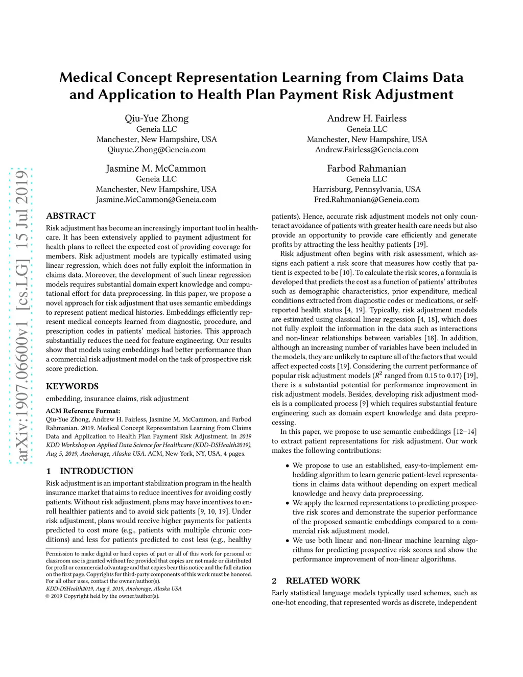 Risk adjustment has become an increasingly important tool in healthcare. It has been extensively applied to payment adjustment for health plans to reflect the expected cost of providing coverage for members. Risk adjustment models are typically estimated using linear regression, which does not fully exploit the information in claims data. Moreover, the development of such linear regression models requires substantial domain expert knowledge and computational effort for data preprocessing. In this paper, we propose a novel approach for risk adjustment that uses semantic embeddings to represent patient medical histories. Embeddings efficiently represent medical concepts learned from diagnostic, procedure, and prescription codes in patients' medical histories. This approach substantially reduces the need for feature engineering. Our results show that models using embeddings had better performance than a commercial risk adjustment model on the task of prospective risk score prediction.