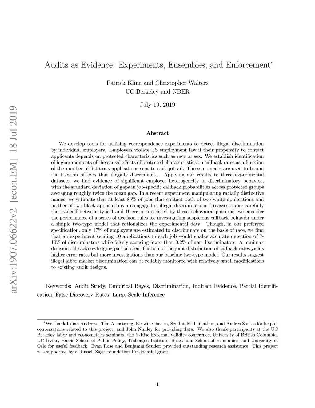 We develop tools for utilizing correspondence experiments to detect illegal discrimination by individual employers. Employers violate US employment law if their propensity to contact applicants depends on protected characteristics such as race or sex. We establish identification of higher moments of the causal effects of protected characteristics on callback rates as a function of the number of fictitious applications sent to each job ad. These moments are used to bound the fraction of jobs that illegally discriminate. Applying our results to three experimental datasets, we find evidence of significant employer heterogeneity in discriminatory behavior, with the standard deviation of gaps in job-specific callback probabilities across protected groups averaging roughly twice the mean gap. In a recent experiment manipulating racially distinctive names, we estimate that at least 85% of jobs that contact both of two white applications and neither of two black applications are engaged in illegal discrimination. To assess the tradeoff between type I and II errors presented by these patterns, we consider the performance of a series of decision rules for investigating suspicious callback behavior under a simple two-type model that rationalizes the experimental data. Though, in our preferred specification, only 17% of employers are estimated to discriminate on the basis of race, we find that an experiment sending 10 applications to each job would enable accurate detection of 7-10% of discriminators while falsely accusing fewer than 0.2% of non-discriminators. A minimax decision rule acknowledging partial identification of the joint distribution of callback rates yields higher error rates but more investigations than our baseline two-type model. Our results suggest illegal labor market discrimination can be reliably monitored with relatively small modifications to existing audit designs.