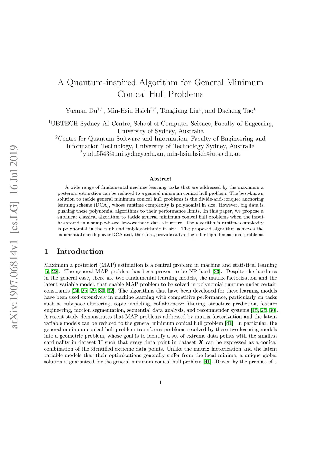 A wide range of fundamental machine learning tasks that are addressed by the maximum a posteriori estimation can be reduced to a general minimum conical hull problem. The best-known solution to tackle general minimum conical hull problems is the divide-and-conquer anchoring learning scheme (DCA), whose runtime complexity is polynomial in size. However, big data is pushing these polynomial algorithms to their performance limits. In this paper, we propose a sublinear classical algorithm to tackle general minimum conical hull problems when the input has stored in a sample-based low-overhead data structure. The algorithm's runtime complexity is polynomial in the rank and polylogarithmic in size. The proposed algorithm achieves the exponential speedup over DCA and, therefore, provides advantages for high dimensional problems.