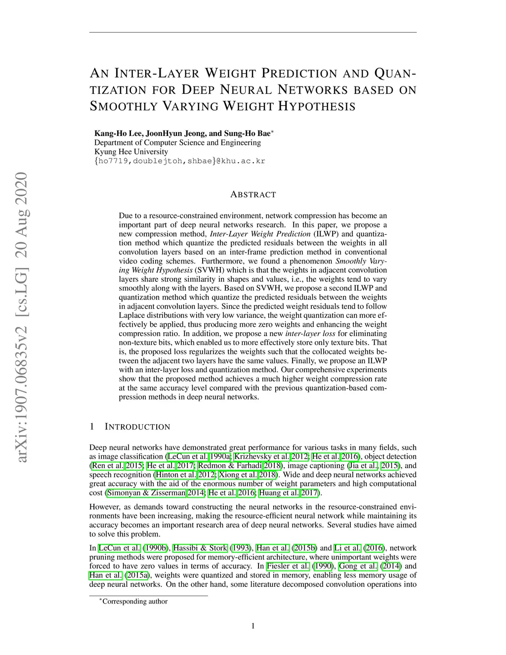 Due to a resource-constrained environment, network compression has become an important part of deep neural networks research. In this paper, we propose a new compression method, \textit{Inter-Layer Weight Prediction} (ILWP) and quantization method which quantize the predicted residuals between the weights in all convolution layers based on an inter-frame prediction method in conventional video coding schemes. Furthermore, we found a phenomenon \textit{Smoothly Varying Weight Hypothesis} (SVWH) which is that the weights in adjacent convolution layers share strong similarity in shapes and values, i.e., the weights tend to vary smoothly along with the layers. Based on SVWH, we propose a second ILWP and quantization method which quantize the predicted residuals between the weights in adjacent convolution layers. Since the predicted weight residuals tend to follow Laplace distributions with very low variance, the weight quantization can more effectively be applied, thus producing more zero weights and enhancing the weight compression ratio. In addition, we propose a new \textit{inter-layer loss} for eliminating non-texture bits, which enabled us to more effectively store only texture bits. That is, the proposed loss regularizes the weights such that the collocated weights between the adjacent two layers have the same values. Finally, we propose an ILWP with an inter-layer loss and quantization method. Our comprehensive experiments show that the proposed method achieves a much higher weight compression rate at the same accuracy level compared with the previous quantization-based compression methods in deep neural networks.