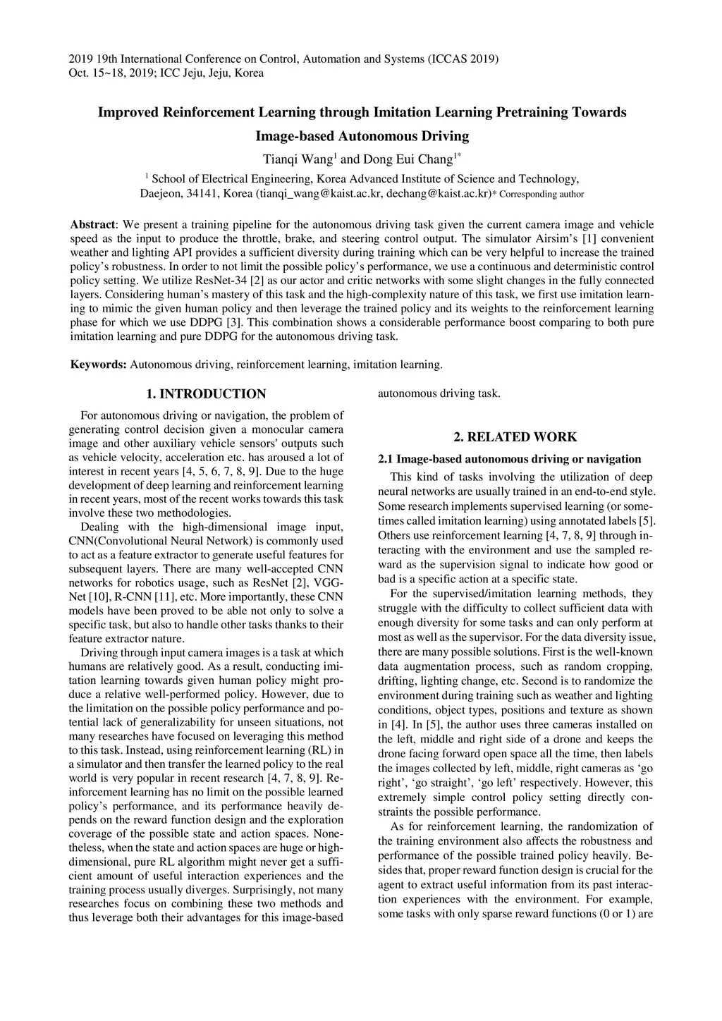 We present a training pipeline for the autonomous driving task given the current camera image and vehicle speed as the input to produce the throttle, brake, and steering control output. The simulator Airsim's convenient weather and lighting API provides a sufficient diversity during training which can be very helpful to increase the trained policy's robustness. In order to not limit the possible policy's performance, we use a continuous and deterministic control policy setting. We utilize ResNet-34 as our actor and critic networks with some slight changes in the fully connected layers. Considering human's mastery of this task and the high-complexity nature of this task, we first use imitation learning to mimic the given human policy and leverage the trained policy and its weights to the reinforcement learning phase for which we use DDPG. This combination shows a considerable performance boost comparing to both pure imitation learning and pure DDPG for the autonomous driving task.