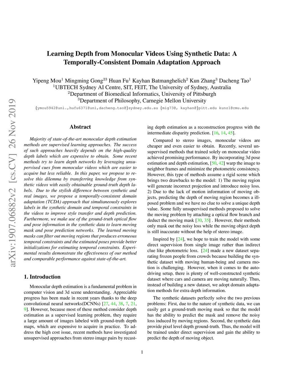 Learning Depth from Monocular Videos Using Synthetic Data: A