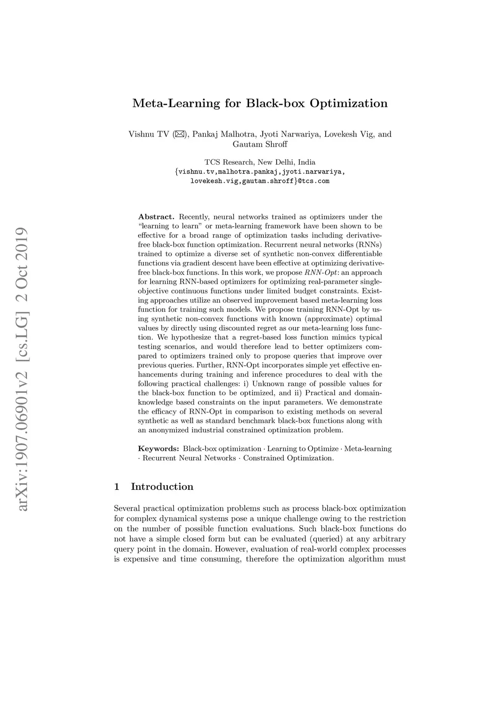Recently, neural networks trained as optimizers under the "learning to learn" or meta-learning framework have been shown to be effective for a broad range of optimization tasks including derivative-free black-box function optimization. Recurrent neural networks (RNNs) trained to optimize a diverse set of synthetic non-convex differentiable functions via gradient descent have been effective at optimizing derivative-free black-box functions. In this work, we propose RNN-Opt: an approach for learning RNN-based optimizers for optimizing real-parameter single-objective continuous functions under limited budget constraints. Existing approaches utilize an observed improvement based meta-learning loss function for training such models. We propose training RNN-Opt by using synthetic non-convex functions with known (approximate) optimal values by directly using discounted regret as our meta-learning loss function. We hypothesize that a regret-based loss function mimics typical testing scenarios, and would therefore lead to better optimizers compared to optimizers trained only to propose queries that improve over previous queries. Further, RNN-Opt incorporates simple yet effective enhancements during training and inference procedures to deal with the following practical challenges: i) Unknown range of possible values for the black-box function to be optimized, and ii) Practical and domain-knowledge based constraints on the input parameters. We demonstrate the efficacy of RNN-Opt in comparison to existing methods on several synthetic as well as standard benchmark black-box functions along with an anonymized industrial constrained optimization problem.