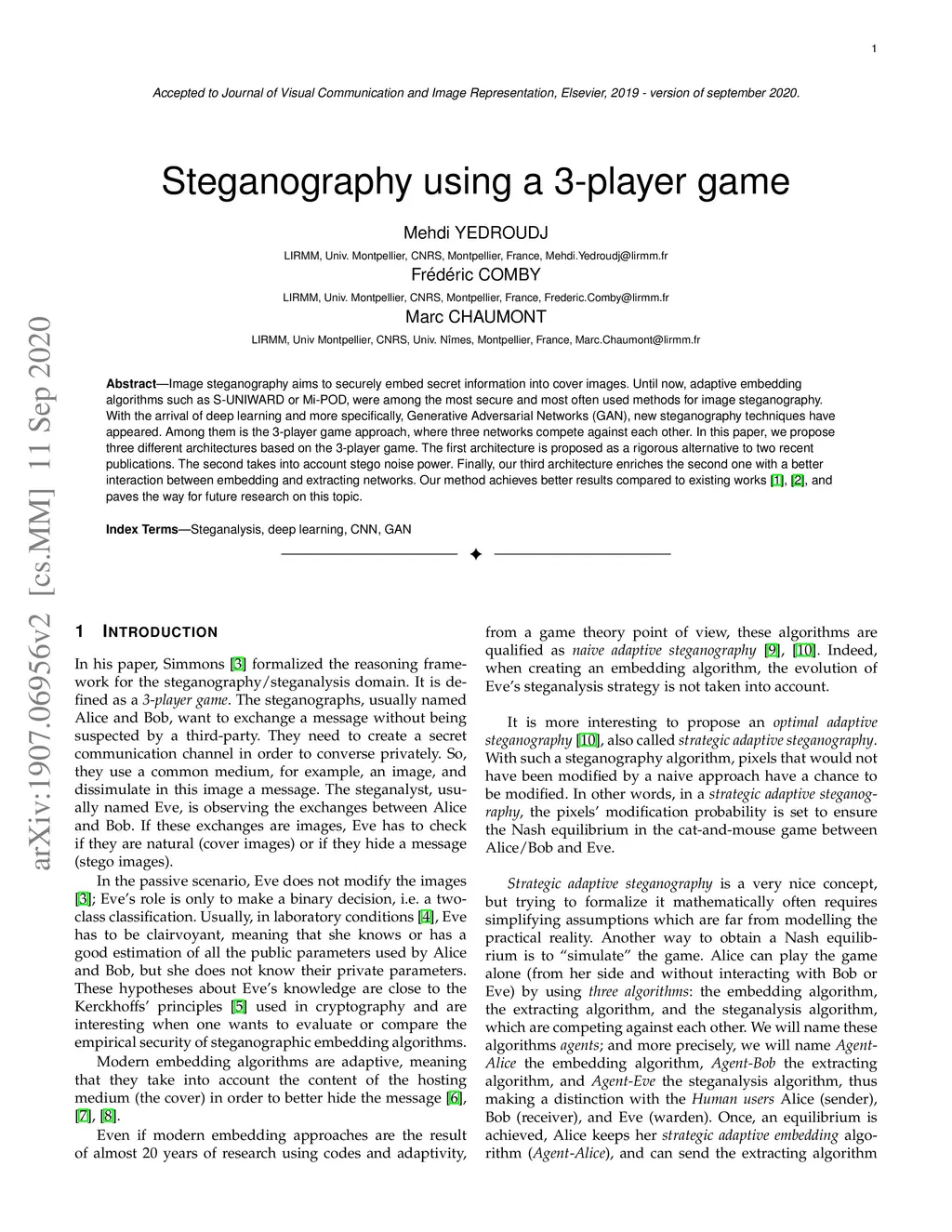 Image steganography aims to securely embed secret information into cover images. Until now, adaptive embedding algorithms such as S-UNIWARD or Mi-POD, are among the most secure and most used methods for image steganography. With the arrival of deep learning and more specifically the Generative Adversarial Networks (GAN), new techniques have appeared. Among these techniques, there is the 3 player game approaches, where three networks compete against each other.In this paper, we propose three different architectures based on the 3 player game. The first-architecture is proposed as a rigorous alternative to two recent publications. The second takes into account stego noise power. Finally, our third architecture enriches the second one with a better interaction between the embedding and extracting networks. Our method achieves better results compared to the existing works GSIVAT, HiDDeN, and paves the way for future research on this topic.