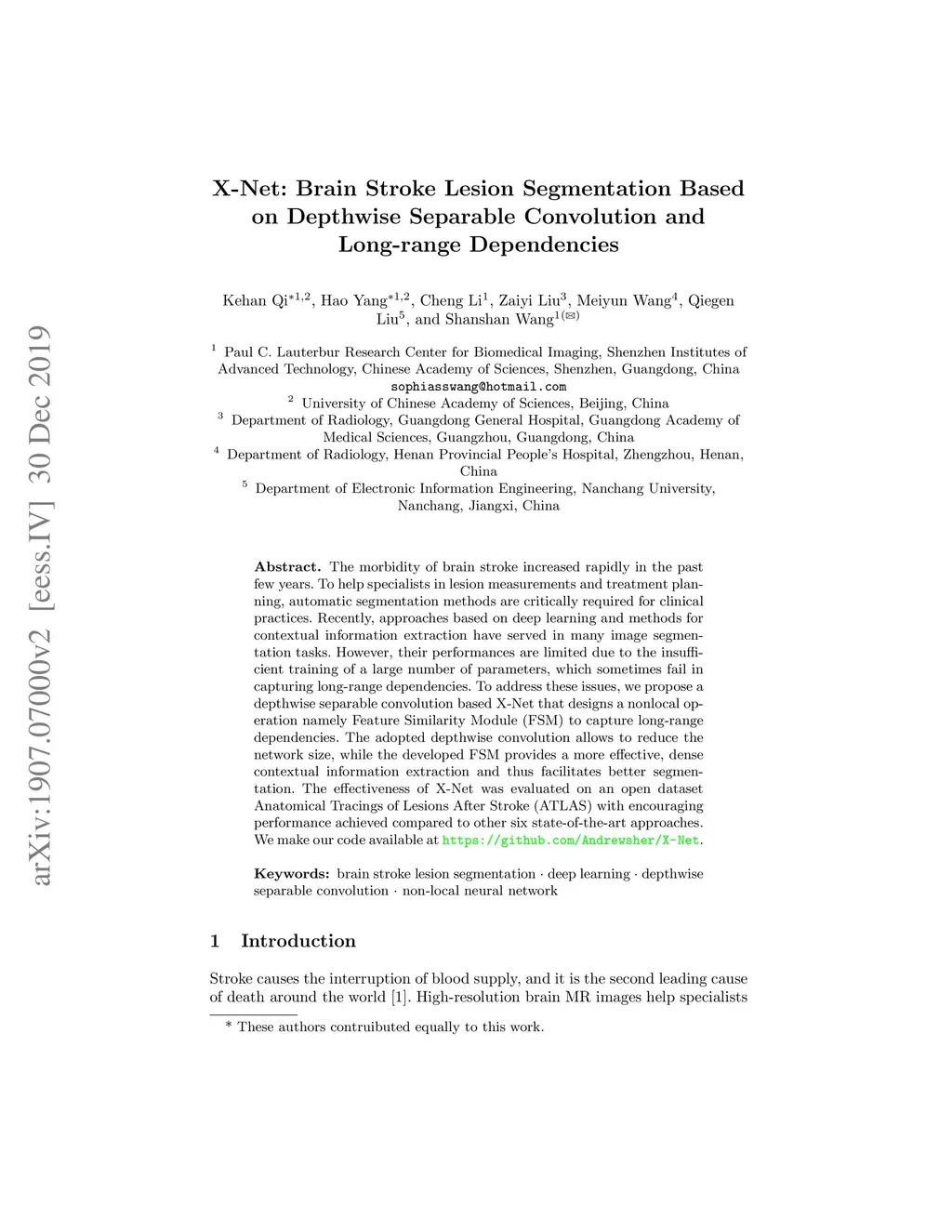 X-Net: Brain Stroke Lesion Segmentation Based on Depthwise Separable