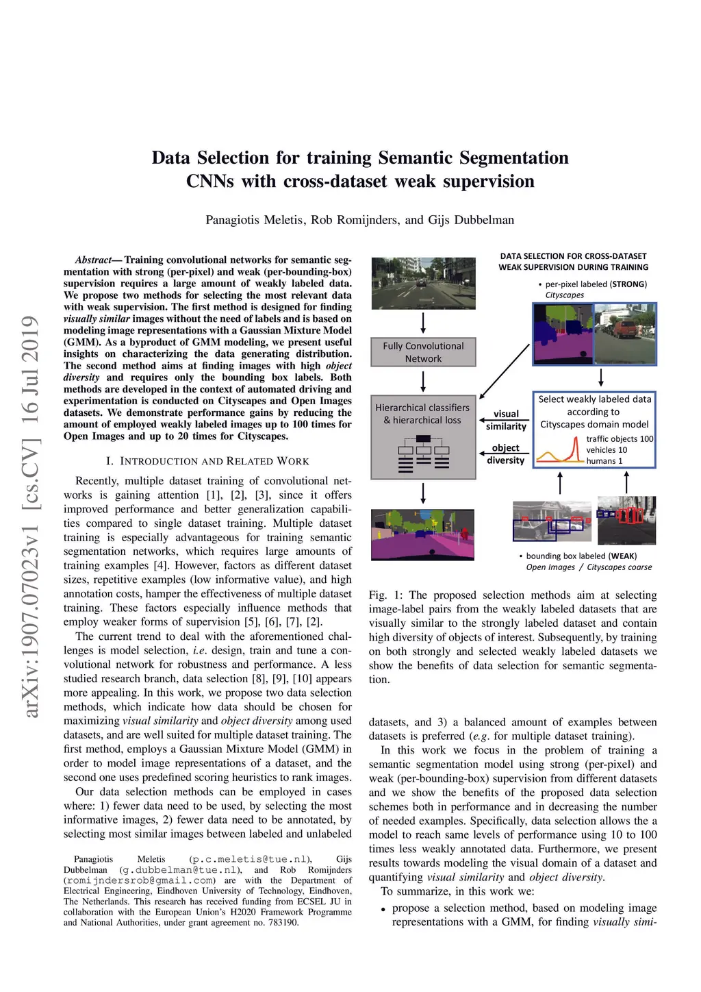 Training convolutional networks for semantic segmentation with strong (per-pixel) and weak (per-bounding-box) supervision requires a large amount of weakly labeled data. We propose two methods for selecting the most relevant data with weak supervision. The first method is designed for finding visually similar images without the need of labels and is based on modeling image representations with a Gaussian Mixture Model (GMM). As a byproduct of GMM modeling, we present useful insights on characterizing the data generating distribution. The second method aims at finding images with high object diversity and requires only the bounding box labels. Both methods are developed in the context of automated driving and experimentation is conducted on Cityscapes and Open Images datasets. We demonstrate performance gains by reducing the amount of employed weakly labeled images up to 100 times for Open Images and up to 20 times for Cityscapes.