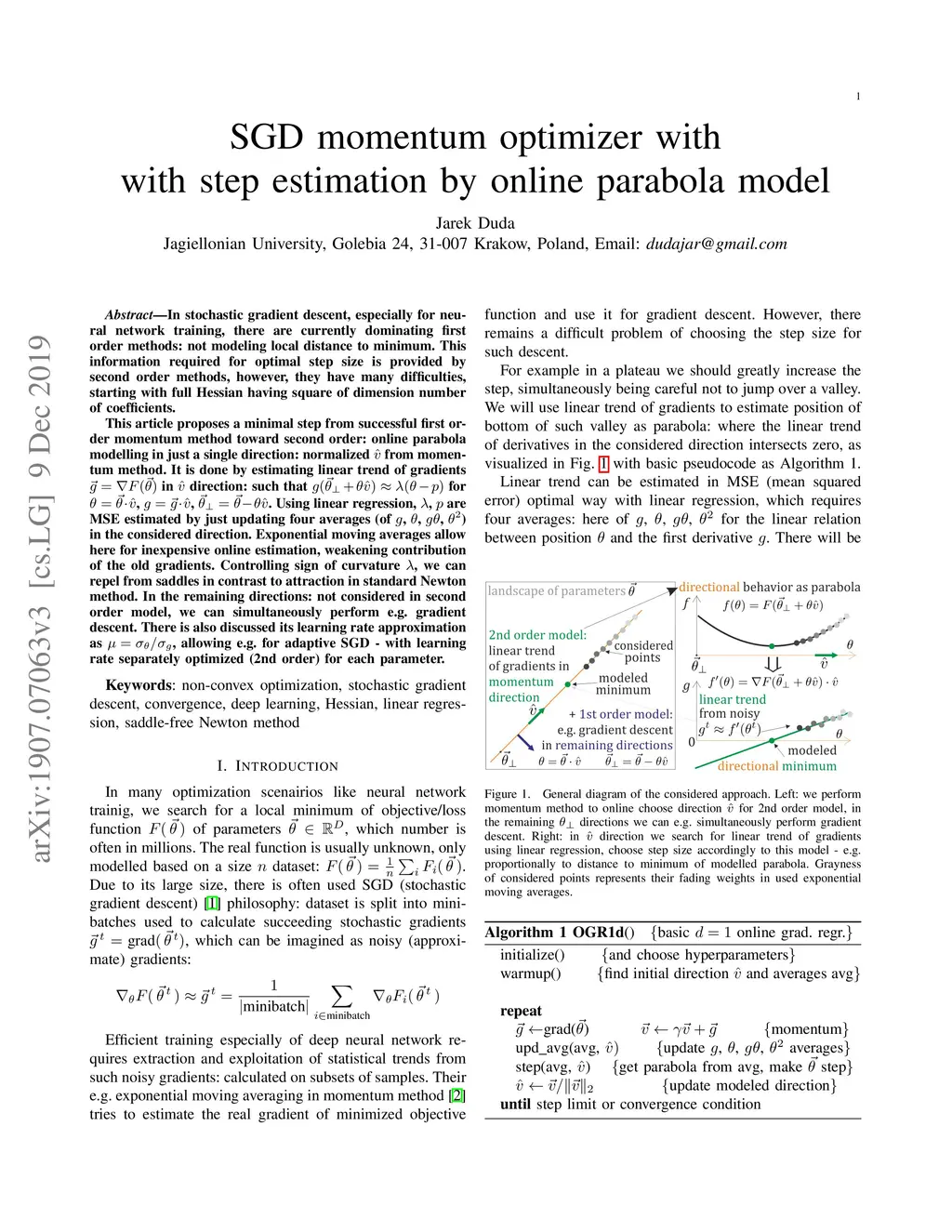 In stochastic gradient descent, especially for neural network training, there are currently dominating first order methods: not modeling local distance to minimum. This information required for optimal step size is provided by second order methods, however, they have many difficulties, starting with full Hessian having square of dimension number of coefficients. This article proposes a minimal step from successful first order momentum method toward second order: online parabola modelling in just a single direction: normalized from momentum method. It is done by estimating linear trend of gradients in direction: such that for , , . Using linear regression, , are MSE estimated by just updating four averages (of , , , ) in the considered direction. Exponential moving averages allow here for inexpensive online estimation, weakening contribution of the old gradients. Controlling sign of curvature , we can repel from saddles in contrast to attraction in standard Newton method. In the remaining directions: not considered in second order model, we can simultaneously perform e.g. gradient descent. There is also discussed its learning rate approximation as , allowing e.g. for adaptive SGD - with learning rate separately optimized (2nd order) for each parameter.