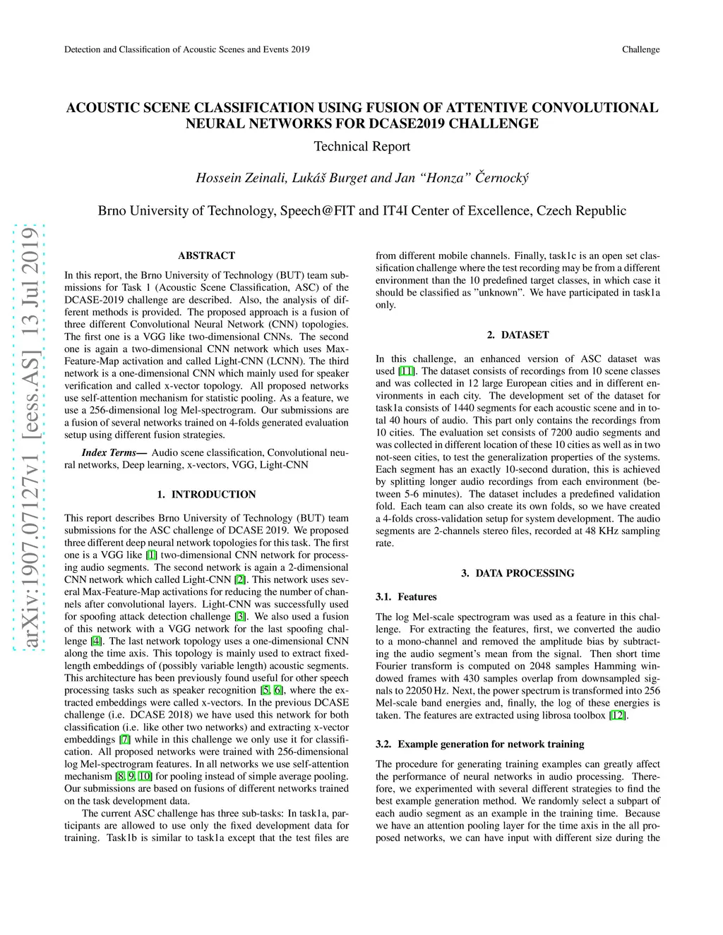 In this report, the Brno University of Technology (BUT) team submissions for Task 1 (Acoustic Scene Classification, ASC) of the DCASE-2019 challenge are described. Also, the analysis of different methods is provided. The proposed approach is a fusion of three different Convolutional Neural Network (CNN) topologies. The first one is a VGG like two-dimensional CNNs. The second one is again a two-dimensional CNN network which uses Max-Feature-Map activation and called Light-CNN (LCNN). The third network is a one-dimensional CNN which mainly used for speaker verification and called x-vector topology. All proposed networks use self-attention mechanism for statistic pooling. As a feature, we use a 256-dimensional log Mel-spectrogram. Our submissions are a fusion of several networks trained on 4-folds generated evaluation setup using different fusion strategies.