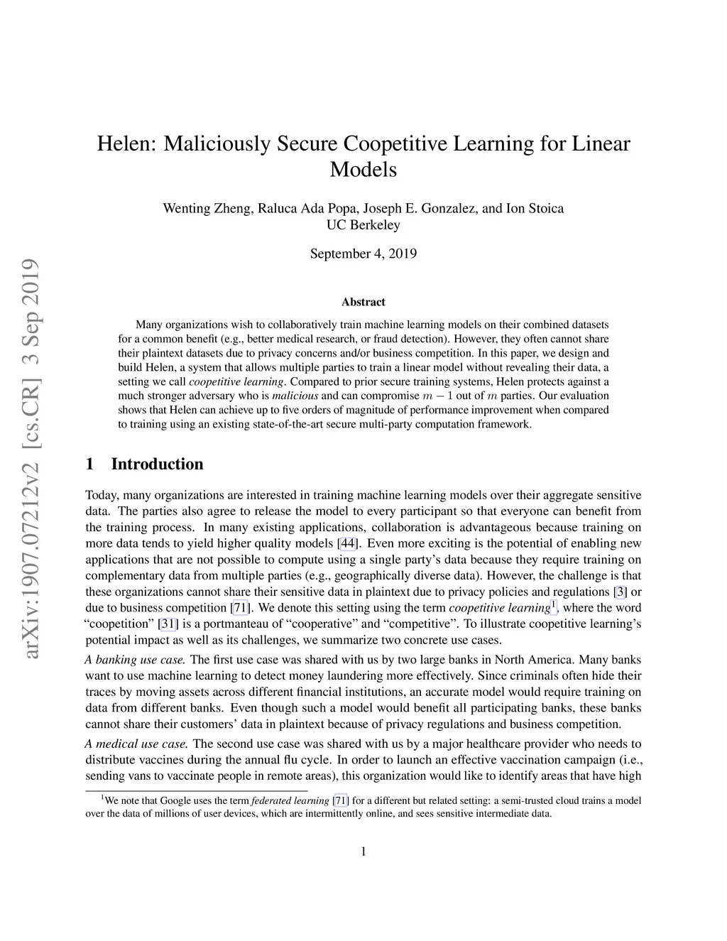 Helen: Maliciously Secure Coopetitive Learning for Linear Models