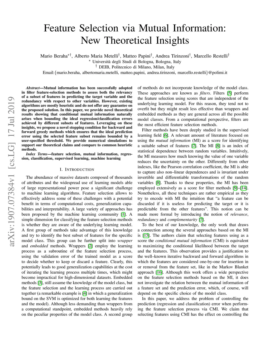 Mutual information has been successfully adopted in filter feature-selection methods to assess both the relevancy of a subset of features in predicting the target variable and the redundancy with respect to other variables. However, existing algorithms are mostly heuristic and do not offer any guarantee on the proposed solution. In this paper, we provide novel theoretical results showing that conditional mutual information naturally arises when bounding the ideal regression/classification errors achieved by different subsets of features. Leveraging on these insights, we propose a novel stopping condition for backward and forward greedy methods which ensures that the ideal prediction error using the selected feature subset remains bounded by a user-specified threshold. We provide numerical simulations to support our theoretical claims and compare to common heuristic methods.