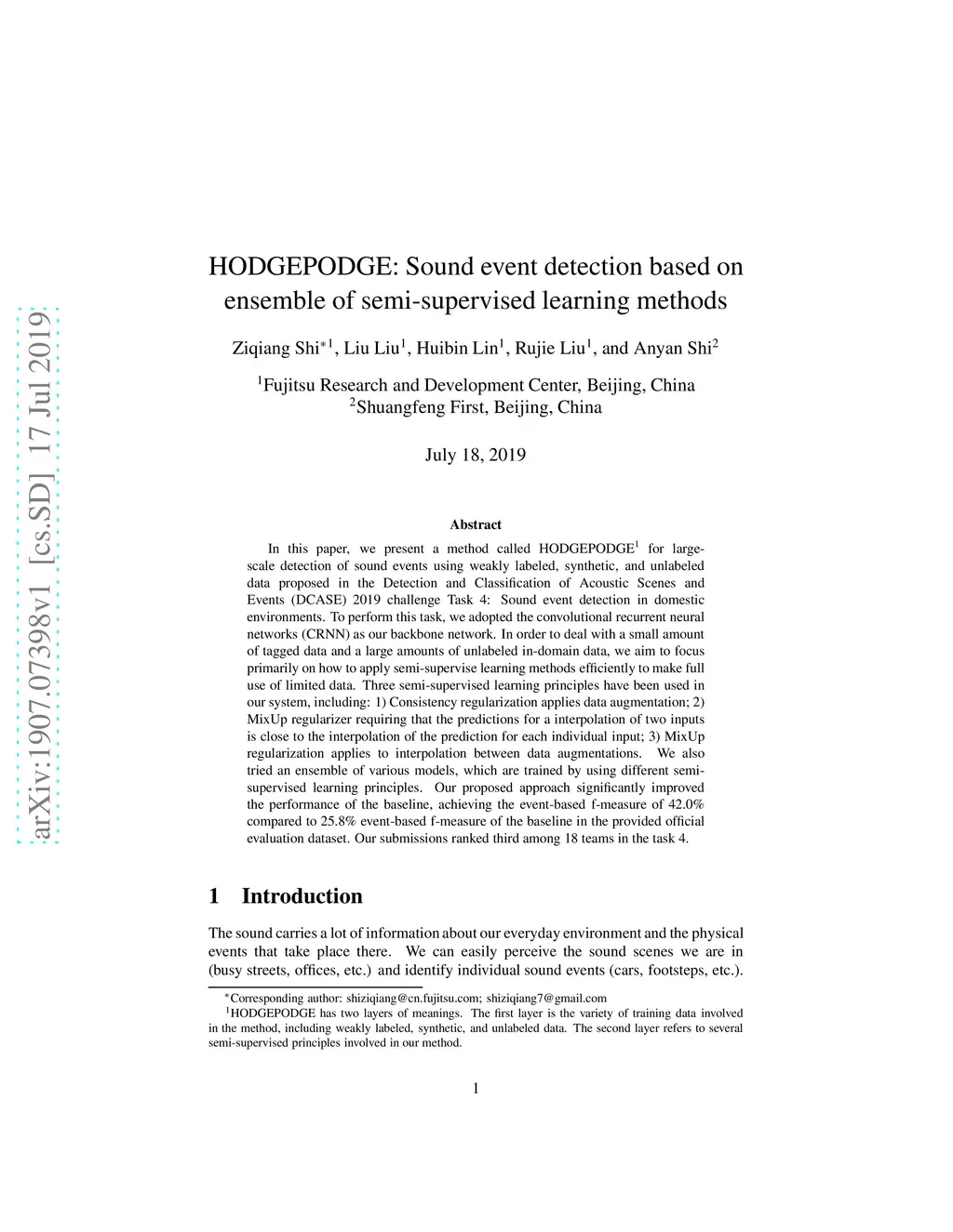 In this paper, we present a method called HODGEPODGE\footnotemark[1] for large-scale detection of sound events using weakly labeled, synthetic, and unlabeled data proposed in the Detection and Classification of Acoustic Scenes and Events (DCASE) 2019 challenge Task 4: Sound event detection in domestic environments. To perform this task, we adopted the convolutional recurrent neural networks (CRNN) as our backbone network. In order to deal with a small amount of tagged data and a large amounts of unlabeled in-domain data, we aim to focus primarily on how to apply semi-supervise learning methods efficiently to make full use of limited data. Three semi-supervised learning principles have been used in our system, including: 1) Consistency regularization applies data augmentation; 2) MixUp regularizer requiring that the predictions for a interpolation of two inputs is close to the interpolation of the prediction for each individual input; 3) MixUp regularization applies to interpolation between data augmentations. We also tried an ensemble of various models, which are trained by using different semi-supervised learning principles. Our proposed approach significantly improved the performance of the baseline, achieving the event-based f-measure of 42.0\% compared to 25.8\% event-based f-measure of the baseline in the provided official evaluation dataset. Our submissions ranked third among 18 teams in the task 4.