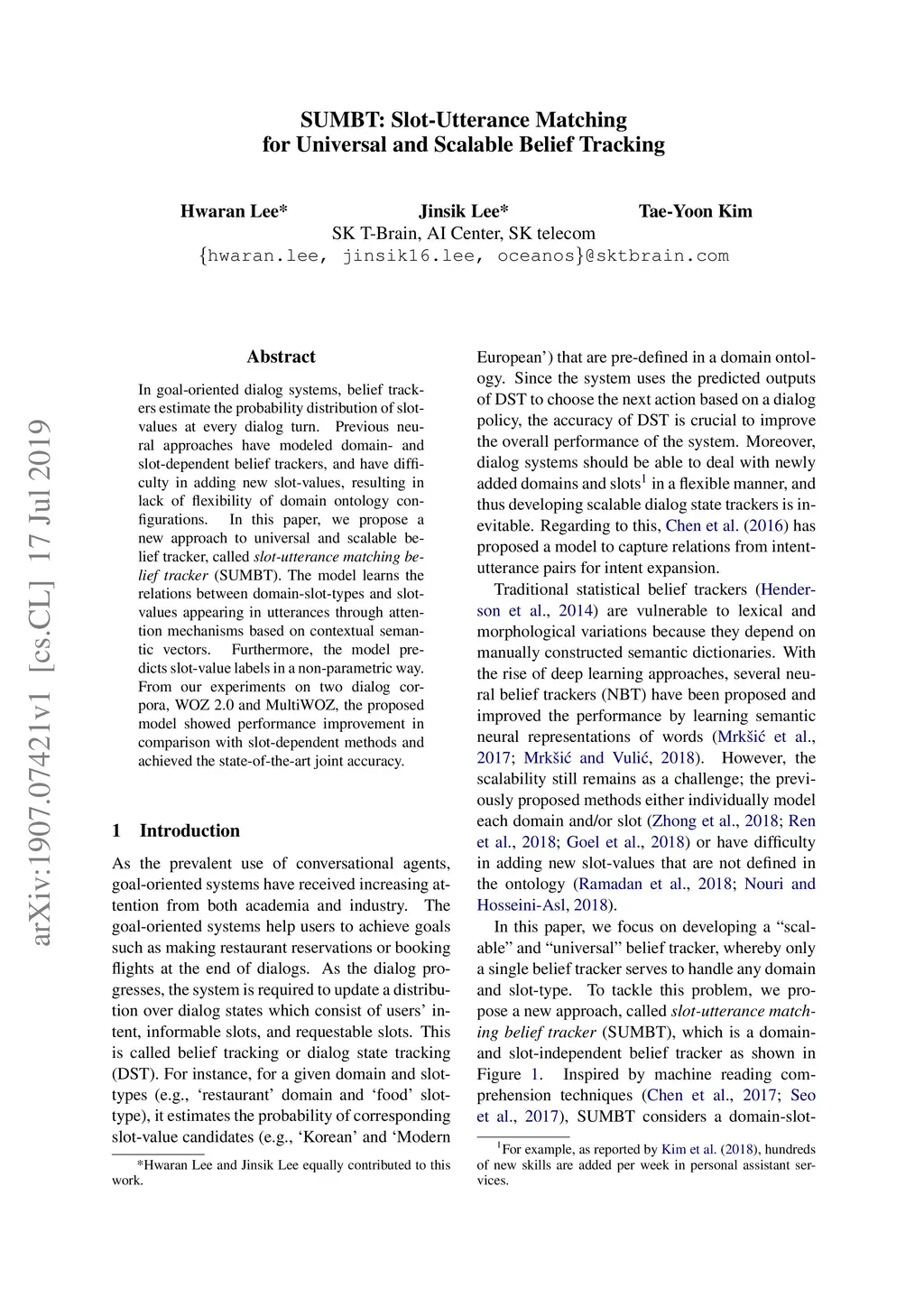 SUMBT: Slot-Utterance Matching for Universal and Scalable Belief