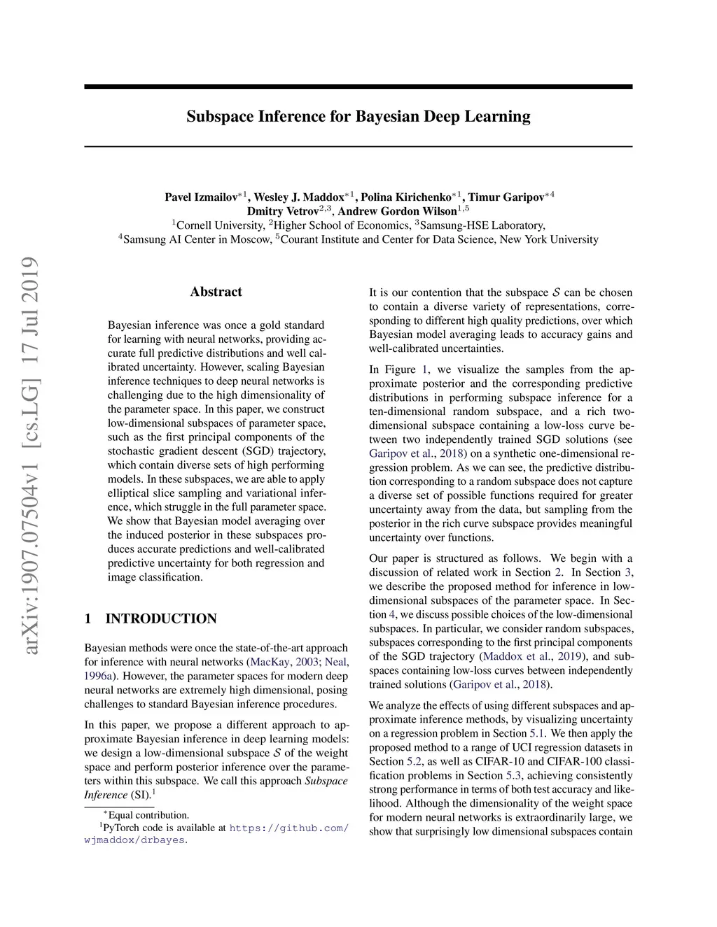 Bayesian inference was once a gold standard for learning with neural networks, providing accurate full predictive distributions and well calibrated uncertainty. However, scaling Bayesian inference techniques to deep neural networks is challenging due to the high dimensionality of the parameter space. In this paper, we construct low-dimensional subspaces of parameter space, such as the first principal components of the stochastic gradient descent (SGD) trajectory, which contain diverse sets of high performing models. In these subspaces, we are able to apply elliptical slice sampling and variational inference, which struggle in the full parameter space. We show that Bayesian model averaging over the induced posterior in these subspaces produces accurate predictions and well calibrated predictive uncertainty for both regression and image classification.