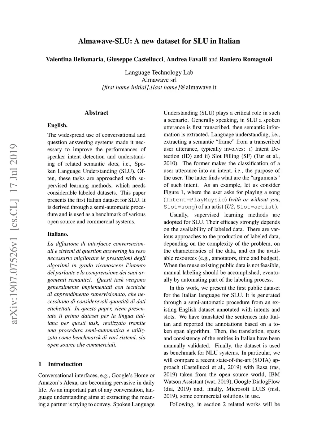 The widespread use of conversational and question answering systems made it necessary to improve the performances of speaker intent detection and understanding of related semantic slots, i.e., Spoken Language Understanding (SLU). Often, these tasks are approached with supervised learning methods, which needs considerable labeled datasets. This paper presents the first Italian dataset for SLU. It is derived through a semi-automatic procedure and is used as a benchmark of various open source and commercial systems.