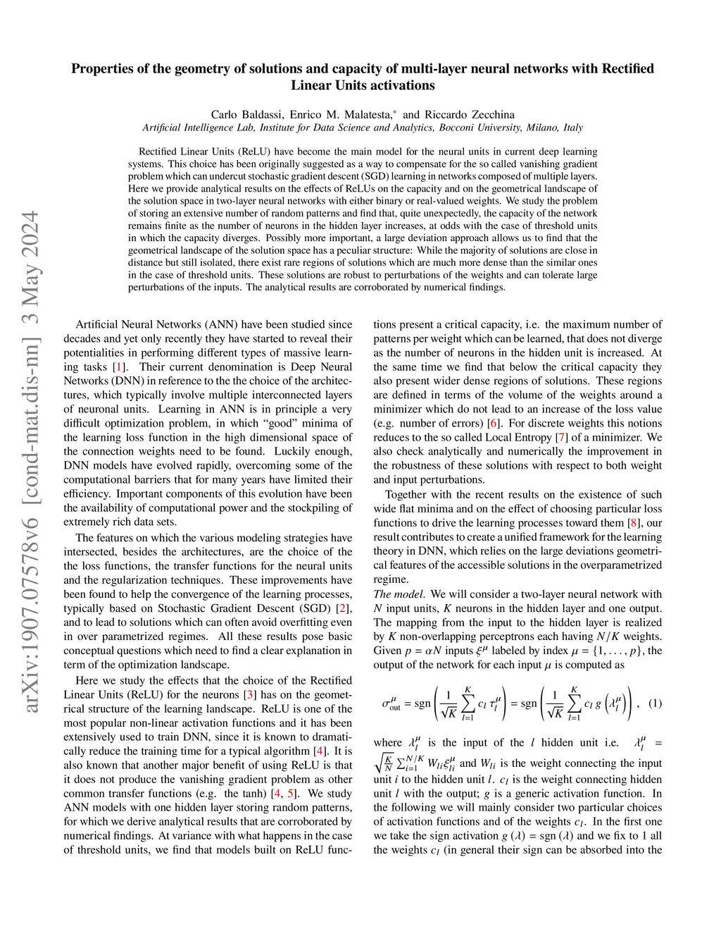 Rectified Linear Units (ReLU) have become the main model for the neural units in current deep learning systems. This choice has been originally suggested as a way to compensate for the so called vanishing gradient problem which can undercut stochastic gradient descent (SGD) learning in networks composed of multiple layers. Here we provide analytical results on the effects of ReLUs on the capacity and on the geometrical landscape of the solution space in two-layer neural networks with either binary or real-valued weights. We study the problem of storing an extensive number of random patterns and find that, quite unexpectedly, the capacity of the network remains finite as the number of neurons in the hidden layer increases, at odds with the case of threshold units in which the capacity diverges. Possibly more important, a large deviation approach allows us to find that the geometrical landscape of the solution space has a peculiar structure: while the majority of solutions are close in distance but still isolated, there exist rare regions of solutions which are much more dense than the similar ones in the case of threshold units. These solutions are robust to perturbations of the weights and can tolerate large perturbations of the inputs. The analytical results are corroborated by numerical findings.