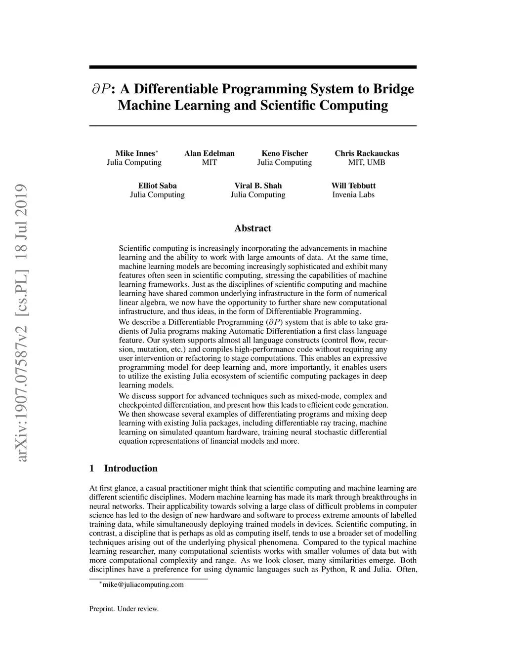 Scientific computing is increasingly incorporating the advancements in machine learning and the ability to work with large amounts of data. At the same time, machine learning models are becoming increasingly sophisticated and exhibit many features often seen in scientific computing, stressing the capabilities of machine learning frameworks. Just as the disciplines of scientific computing and machine learning have shared common underlying infrastructure in the form of numerical linear algebra, we now have the opportunity to further share new computational infrastructure, and thus ideas, in the form of Differentiable Programming. We describe Zygote, a Differentiable Programming system that is able to take gradients of general program structures. We implement this system in the Julia programming language. Our system supports almost all language constructs (control flow, recursion, mutation, etc.) and compiles high-performance code without requiring any user intervention or refactoring to stage computations. This enables an expressive programming model for deep learning, but more importantly, it enables us to incorporate a large ecosystem of libraries in our models in a straightforward way. We discuss our approach to automatic differentiation, including its support for advanced techniques such as mixed-mode, complex and checkpointed differentiation, and present several examples of differentiating programs.