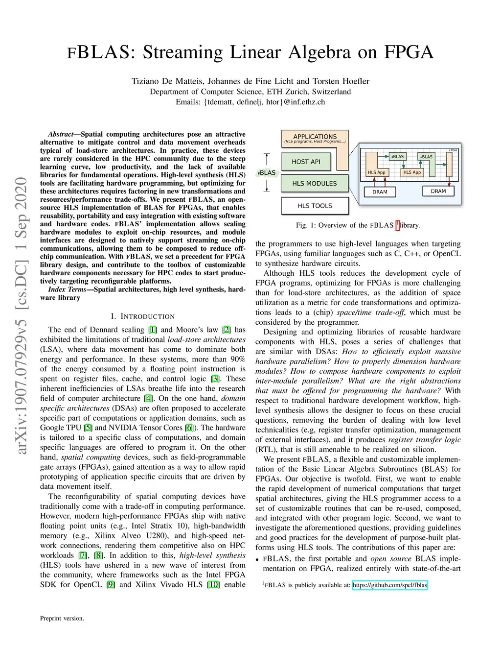 Spatial computing architectures pose an attractive alternative to mitigate control and data movement overheads typical of load-store architectures. In practice, these devices are rarely considered in the HPC community due to the steep learning curve, low productivity and lack of available libraries for fundamental operations. High-level synthesis (HLS) tools are facilitating hardware programming, but optimizing for these architectures requires factoring in new transformations and resources/performance trade-offs. We present FBLAS, an open-source HLS implementation of BLAS for FPGAs, that enables reusability, portability and easy integration with existing software and hardware codes. FBLAS' implementation allows scaling hardware modules to exploit on-chip resources, and module interfaces are designed to natively support streaming on-chip communications, allowing them to be composed to reduce off-chip communication. With FBLAS, we set a precedent for FPGA library design, and contribute to the toolbox of customizable hardware components necessary for HPC codes to start productively targeting reconfigurable platforms.