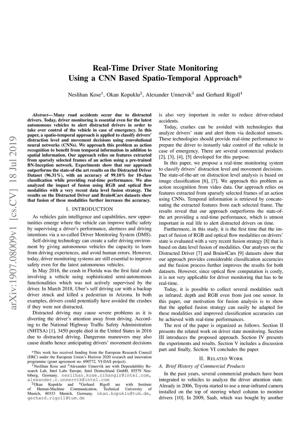 Many road accidents occur due to distracted drivers. Today, driver monitoring is essential even for the latest autonomous vehicles to alert distracted drivers in order to take over control of the vehicle in case of emergency. In this paper, a spatio-temporal approach is applied to classify drivers' distraction level and movement decisions using convolutional neural networks (CNNs). We approach this problem as action recognition to benefit from temporal information in addition to spatial information. Our approach relies on features extracted from sparsely selected frames of an action using a pre-trained BN-Inception network. Experiments show that our approach outperforms the state-of-the art results on the Distracted Driver Dataset (96.31%), with an accuracy of 99.10% for 10-class classification while providing real-time performance. We also analyzed the impact of fusion using RGB and optical flow modalities with a very recent data level fusion strategy. The results on the Distracted Driver and Brain4Cars datasets show that fusion of these modalities further increases the accuracy.