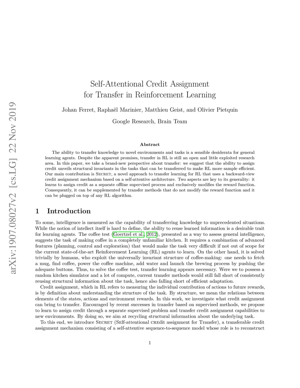 The ability to transfer knowledge to novel environments and tasks is a sensible desiderata for general learning agents. Despite the apparent promises, transfer in RL is still an open and little exploited research area. In this paper, we take a brand-new perspective about transfer: we suggest that the ability to assign credit unveils structural invariants in the tasks that can be transferred to make RL more sample-efficient. Our main contribution is SECRET, a novel approach to transfer learning for RL that uses a backward-view credit assignment mechanism based on a self-attentive architecture. Two aspects are key to its generality: it learns to assign credit as a separate offline supervised process and exclusively modifies the reward function. Consequently, it can be supplemented by transfer methods that do not modify the reward function and it can be plugged on top of any RL algorithm.