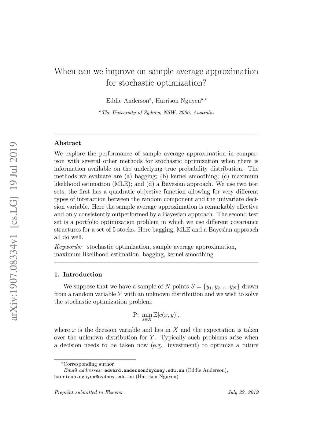 We explore the performance of sample average approximation in comparison with several other methods for stochastic optimization when there is information available on the underlying true probability distribution. The methods we evaluate are (a) bagging; (b) kernel smoothing; (c) maximum likelihood estimation (MLE); and (d) a Bayesian approach. We use two test sets, the first has a quadratic objective function allowing for very different types of interaction between the random component and the univariate decision variable. Here the sample average approximation is remarkably effective and only consistently outperformed by a Bayesian approach. The second test set is a portfolio optimization problem in which we use different covariance structures for a set of 5 stocks. Here bagging, MLE and a Bayesian approach all do well.