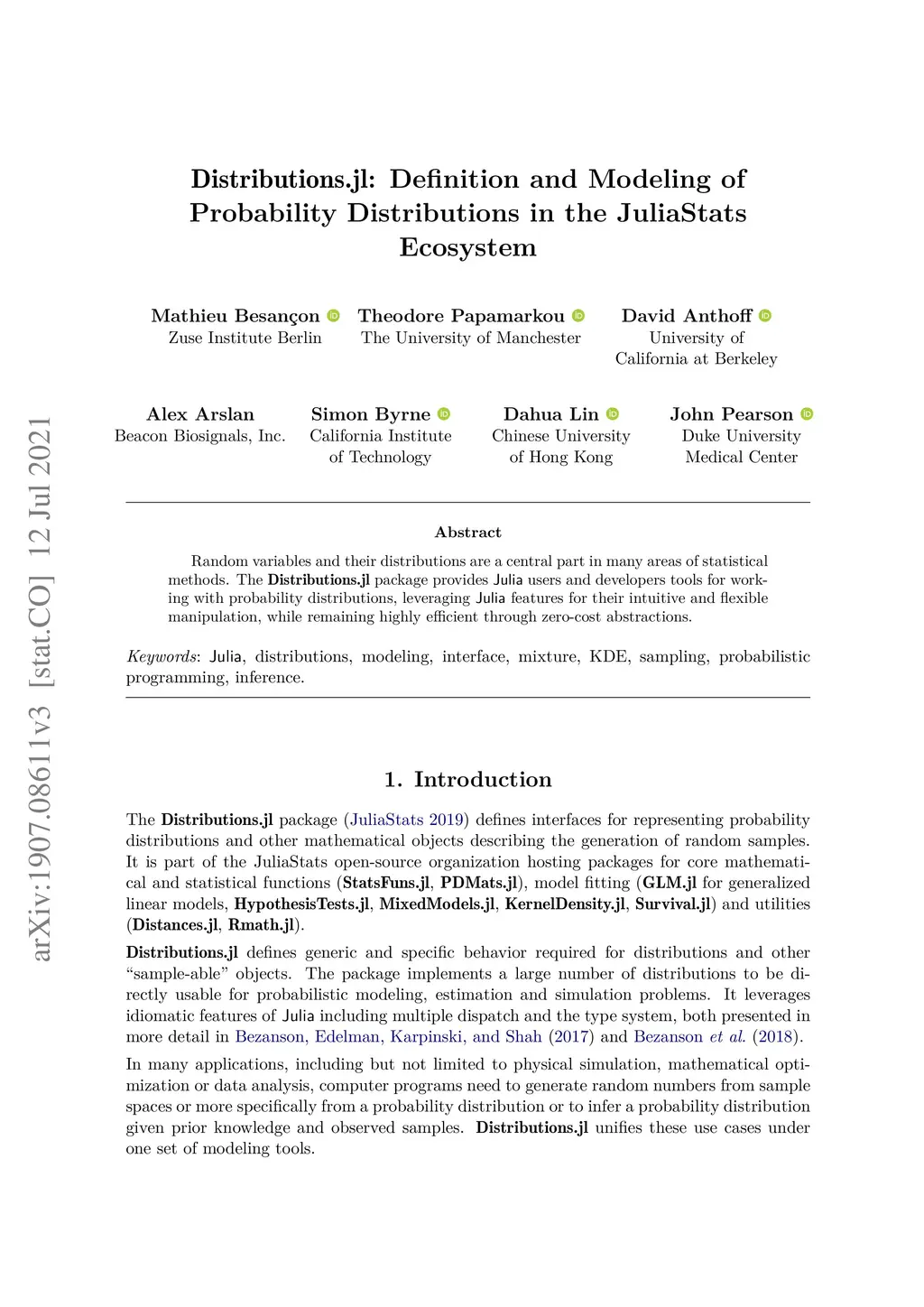 Distributions.jl: Definition and Modeling of Probability Distributions