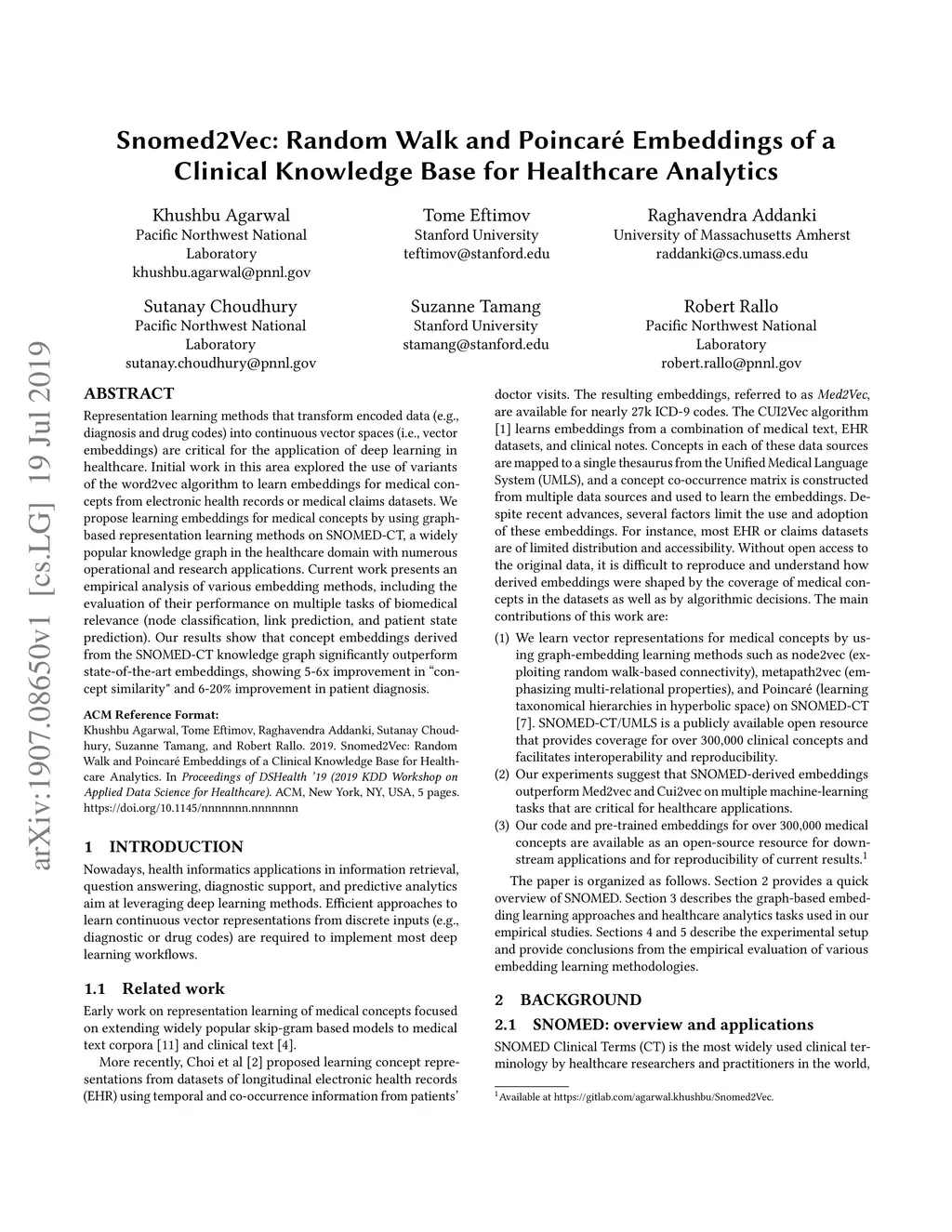 Snomed2Vec: Random Walk and Poincaré Embeddings of a Clinical