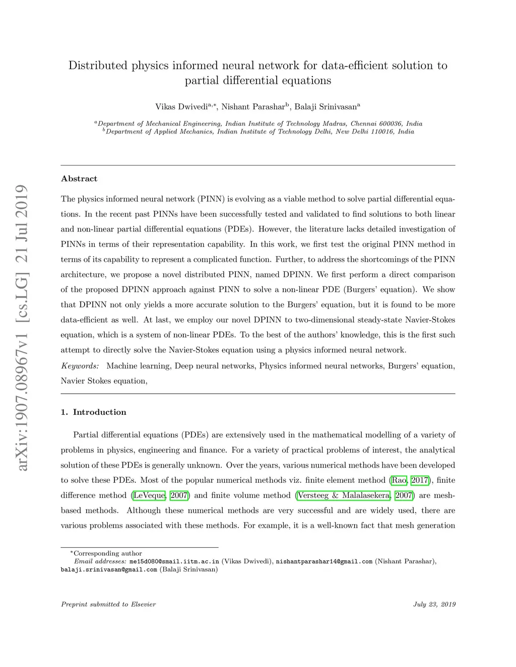The physics informed neural network (PINN) is evolving as a viable method to solve partial differential equations. In the recent past PINNs have been successfully tested and validated to find solutions to both linear and non-linear partial differential equations (PDEs). However, the literature lacks detailed investigation of PINNs in terms of their representation capability. In this work, we first test the original PINN method in terms of its capability to represent a complicated function. Further, to address the shortcomings of the PINN architecture, we propose a novel distributed PINN, named DPINN. We first perform a direct comparison of the proposed DPINN approach against PINN to solve a non-linear PDE (Burgers' equation). We show that DPINN not only yields a more accurate solution to the Burgers' equation, but it is found to be more data-efficient as well. At last, we employ our novel DPINN to two-dimensional steady-state Navier-Stokes equation, which is a system of non-linear PDEs. To the best of the authors' knowledge, this is the first such attempt to directly solve the Navier-Stokes equation using a physics informed neural network.