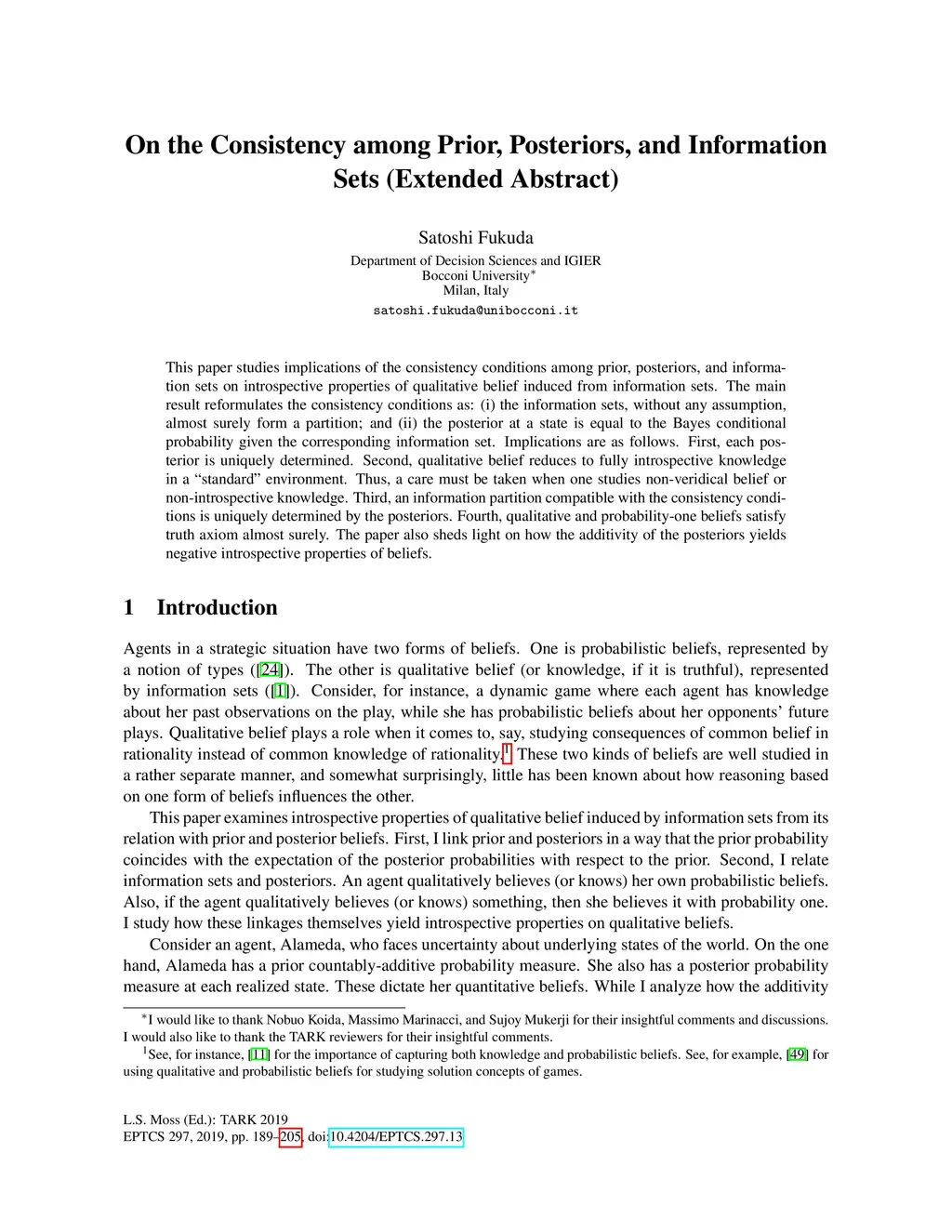 This paper studies implications of the consistency conditions among prior, posteriors, and information sets on introspective properties of qualitative belief induced from information sets. The main result reformulates the consistency conditions as: (i) the information sets, without any assumption, almost surely form a partition; and (ii) the posterior at a state is equal to the Bayes conditional probability given the corresponding information set. Implications are as follows. First, each posterior is uniquely determined. Second, qualitative belief reduces to fully introspective knowledge in a ``standard'' environment. Thus, a care must be taken when one studies non-veridical belief or non-introspective knowledge. Third, an information partition compatible with the consistency conditions is uniquely determined by the posteriors. Fourth, qualitative and probability-one beliefs satisfy truth axiom almost surely. The paper also sheds light on how the additivity of the posteriors yields negative introspective properties of beliefs.